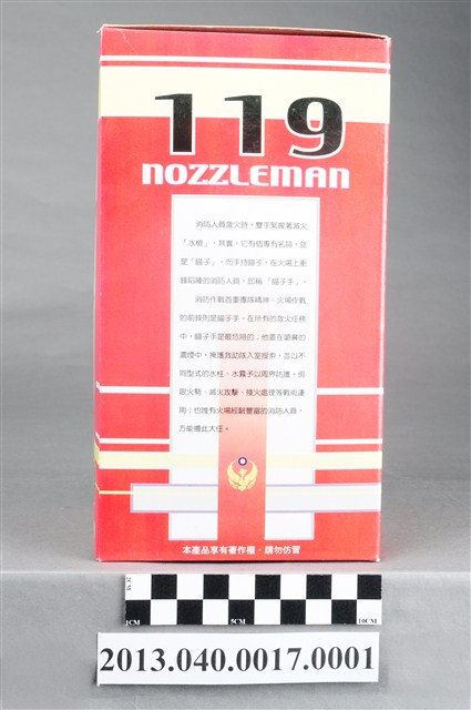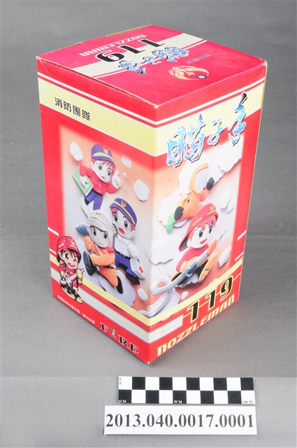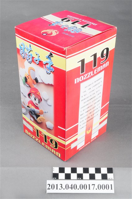 1. 本件為臺南縣義消總隊1999年發行之消防寶寶瞄子手存錢筒,玩偶代表義消人員於滅火灌救時著滅火裝備之造型,男子臉部表情十分可愛,大眼睛張口微笑,頭戴銀色防護頭盔,其正面有消防隊鳳凰徽章及「台南縣義消總隊」紅色字樣,身穿銀色上衣與銀色長褲,上衣右側領口有「1999」生產年份字樣,肩後背著黃色氧氣瓶,手戴銀色手套,雙手持滅火灌救水帶之瞄子,腳穿黃色防護鞋。公仔可作為撲滿使用,存錢孔位於頭頂,取出孔位於底部。