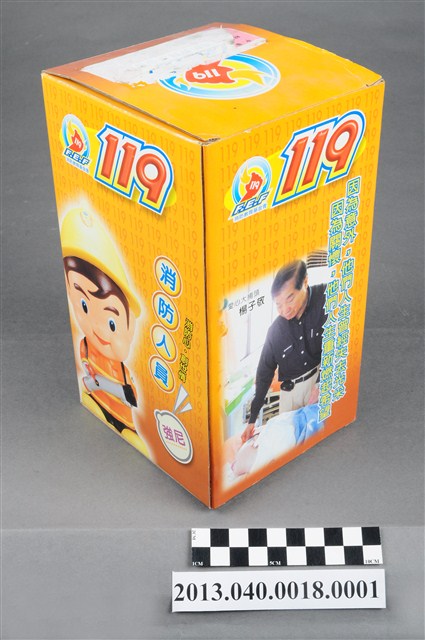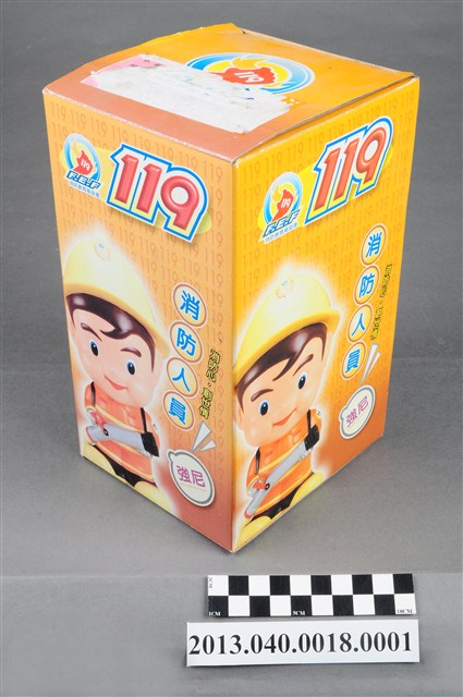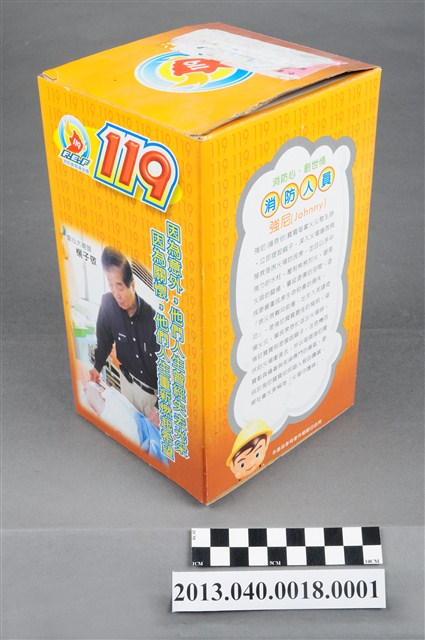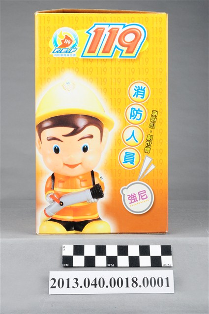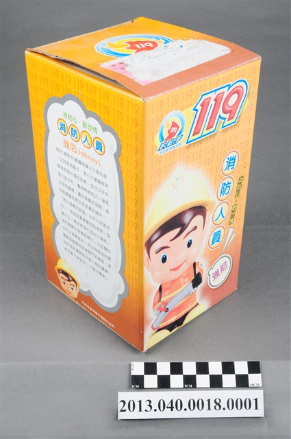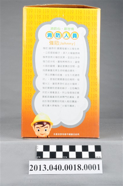 1. 消防教育基金會2004年發行之「打火三兄弟消防寶寶」公仔存錢筒,玩偶代表消防人員「強尼」,頭帶黃色防護帽,正面有消防鳳凰標幟及「消防教育基金會」紅色字樣,身穿橘色連身制服,背背氧氣筒,手戴銀色手套,雙手持消防滅火水帶瞄子,腳穿黑、黃色大頭鞋。