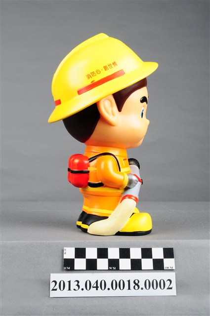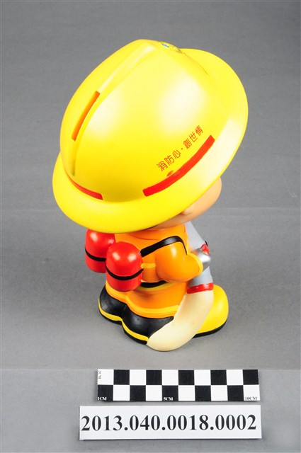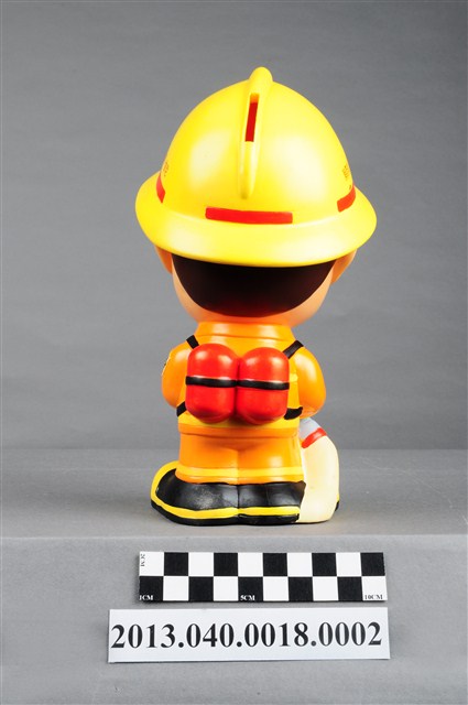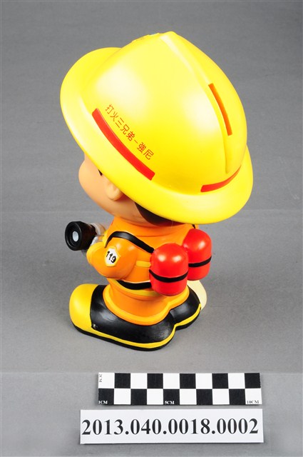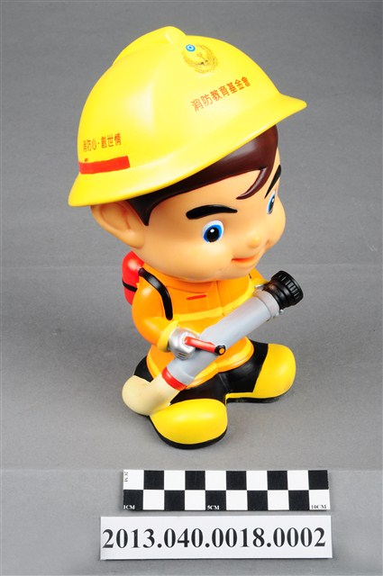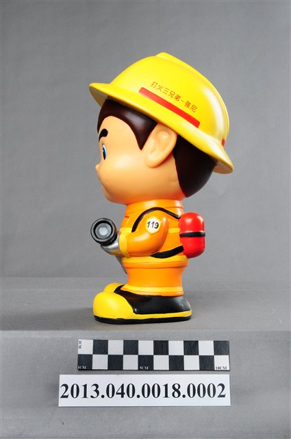 1. 消防教育基金會2004年發行之「打火三兄弟消防寶寶」公仔存錢筒,玩偶代表消防人員「強尼」,頭帶黃色防護帽,正面有消防鳳凰標幟及「消防教育基金會」紅色字樣,身穿橘色連身制服,背背氧氣筒,手戴銀色手套,雙手持消防滅火水帶瞄子,腳穿黑、黃色大頭鞋。