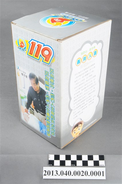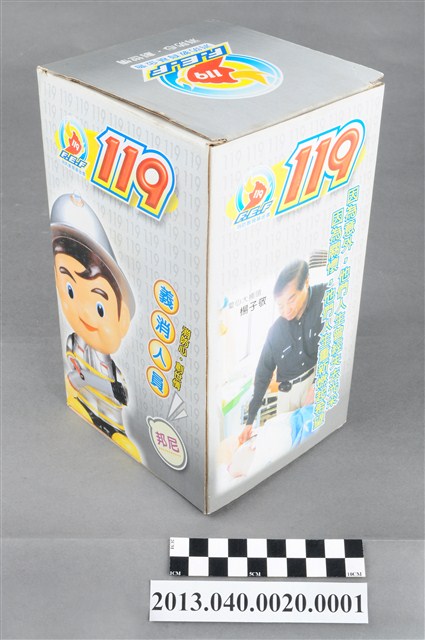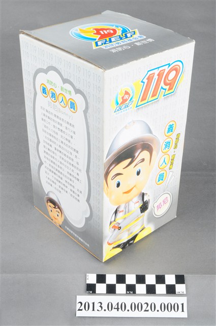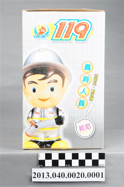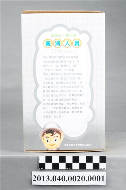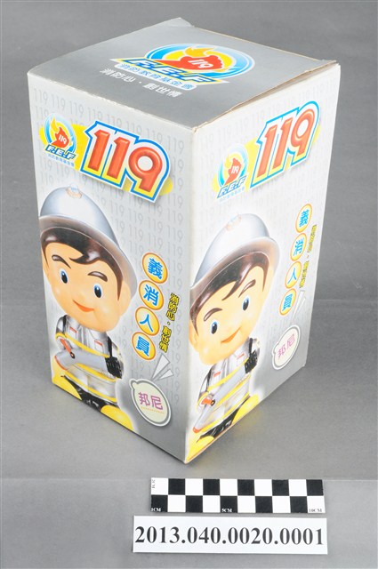 1. 消防教育基金會2004年發行之「打火三兄弟消防寶寶」公仔存錢筒,玩偶代表消防志工「邦尼」,頭帶銀色防護帽,正面有消防鳳凰標幟及「消防教育基金會」黃色字樣,身穿銀色連身制服,背背氧氣筒,手戴銀色手套,雙手持消防滅火水帶瞄子,腳穿黑、黃色大頭鞋。