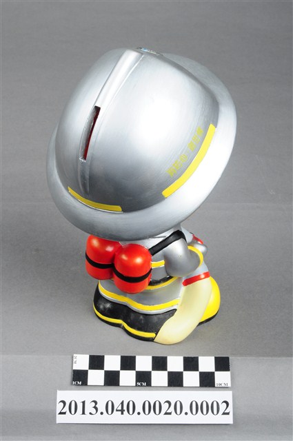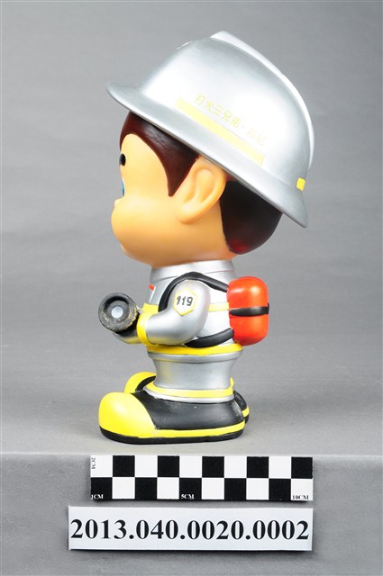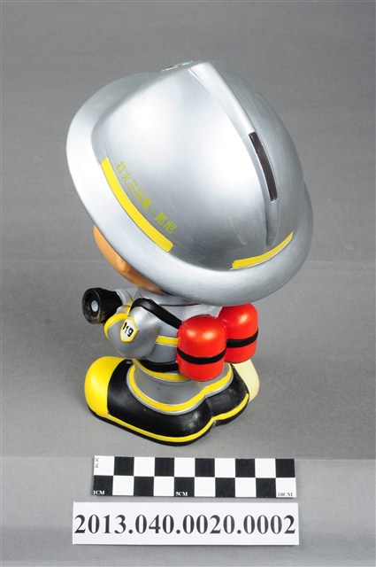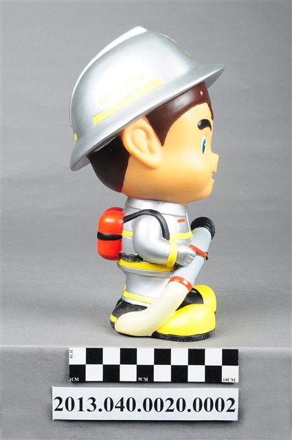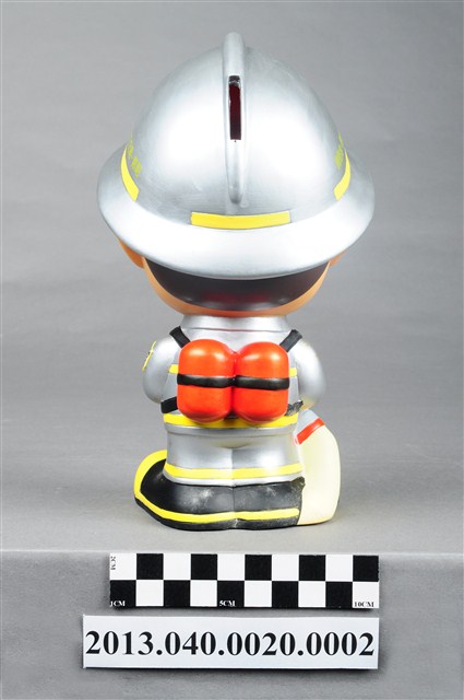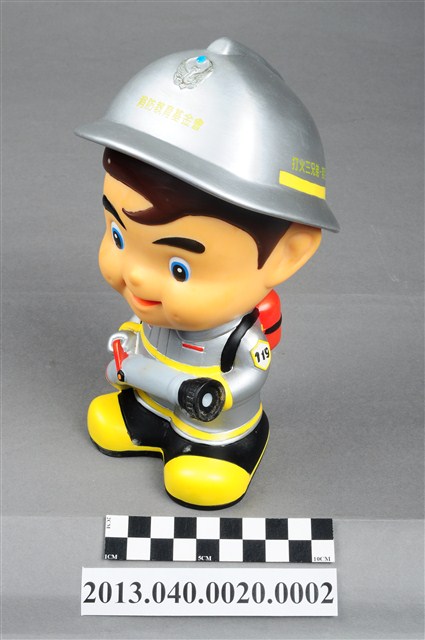 1. 消防教育基金會2004年發行之「打火三兄弟消防寶寶」公仔存錢筒,玩偶代表消防志工「邦尼」,頭帶銀色防護帽,正面有消防鳳凰標幟及「消防教育基金會」黃色字樣,身穿銀色連身制服,背背氧氣筒,手戴銀色手套,雙手持消防滅火水帶瞄子,腳穿黑、黃色大頭鞋。
