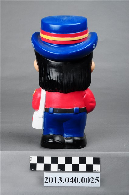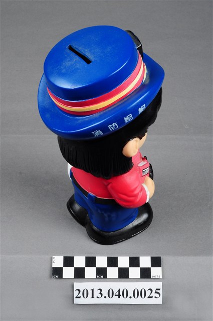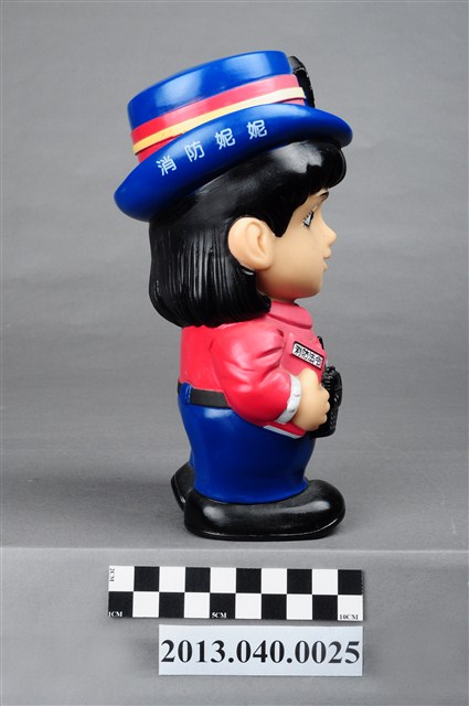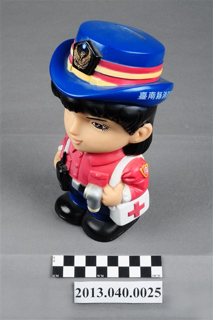 1. 臺南縣消防局發行「消防妮妮」公仔存錢筒,為國內女版消防寶寶系列之一,玩偶頭戴藍色帽,帽子的正中間有消防鳳凰標誌,帽子的左側印上「台南縣消防局」的字樣,帽子的右側印上「消防妮妮」的白色字樣。身穿紅色上衣,左肩背著白色救護箱,臂章上有個「119」字樣,腰際繫有一支手電筒,右手抱著一本「消防法令」,腰際上有一支無線電,下半身為藍長褲與黑鞋。因可作為撲滿使用,頭頂有一存錢孔,底部為取錢孔。從制服顏色判斷,推測為造型女指揮官。