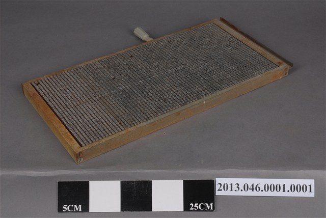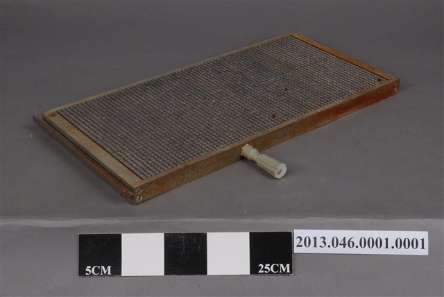 中文打字機的字盤,可排滿35字(長)X70字(寬),共2450字,上留有中文鉛字2000多字。其塑膠拉把有斷裂情形。