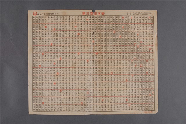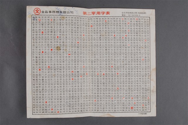 日經タイプライター(打字機)株式會社生產供中文打字機使用之鉛字,主要為「中文排列第一罕見字」,以木盒裝,木盒內附有所有鉛字明細的「中文排列第一罕見字表」,依部首排列,分為3格存放,約1500多字。木盒蓋的金屬連接鎖已脫落,「中文排列第一罕見字表」紙張有嚴重破損情形。另附有2張字表,一為金益事務機有限公司14級粗明體的「第二罕用字表」,另一為樺文打字印刷有限公司四號正楷體的「第三罕用字表」。