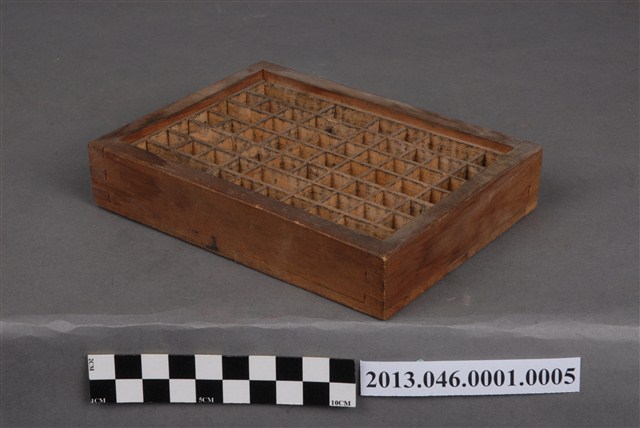 木製撿字盒,供排字使用,分為7(長)X10(寬)行,共70格。