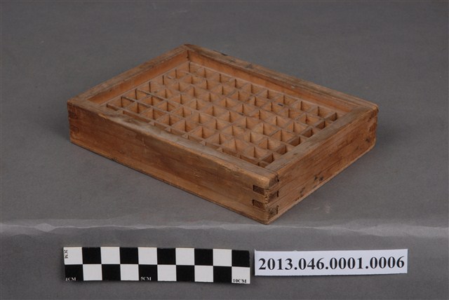 木製撿字盒,供排字使用,分為7(長)X10(寬)行,共70格。