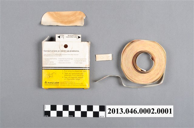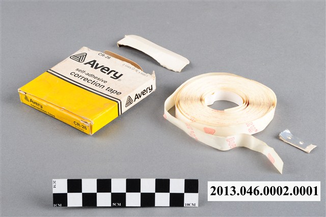 美國文具公司Avery公司生產之修正帶(Correction Tape),附有包裝紙盒,主要作為打字改錯、修正使用,型號:CR-16,為修正一行之修正帶,修正帶尺寸為1/6” X 600”,紙盒背面印有使用方式的圖示。