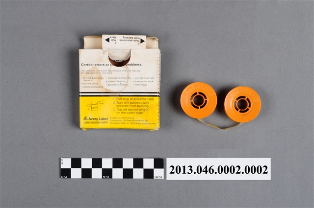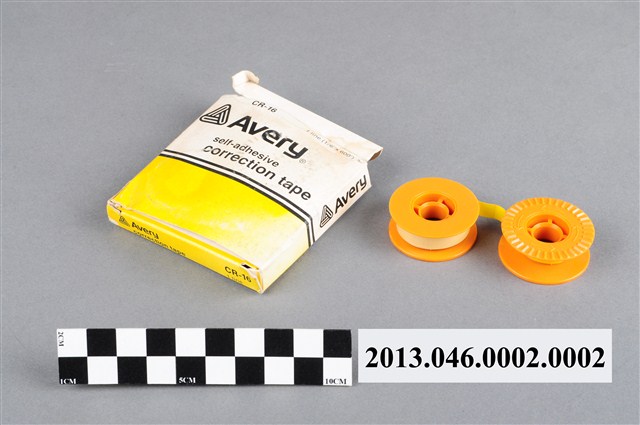 美國文具公司Avery Label公司生產之修正帶(Correction Tape),附有包裝紙盒,主要作為打字改錯、修正使用,型號:CR-26,為修正二行之修正帶,修正帶尺寸為2/6” X 600”,紙盒背面印有使用方式的圖示。