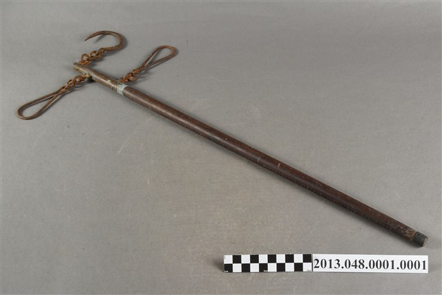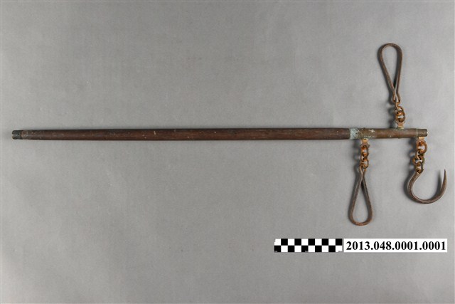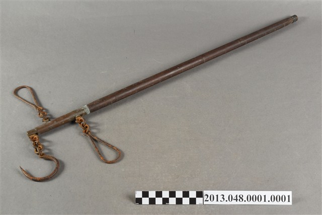 此物件為桿秤是一種秤重的器具。約民國20年左右仁壽堂藥房所使用之量秤工具,該物件在本館亦有蒐藏相同型式文物,而雖外型一樣但會隨依大小長度的不同,量秤物品的種類和重量也會不同,而此物件本館蒐藏同樣類型之文物有2件相仿,但本館所蒐藏的文物來源出處及使用背景較不明,反之該件則背景資料和過去歷程較為明確,可清楚得知當時即仁壽堂藥房用於量秤藥材等商業用途,且該物件保存狀況及完整度良好故此建議可進行蒐藏。