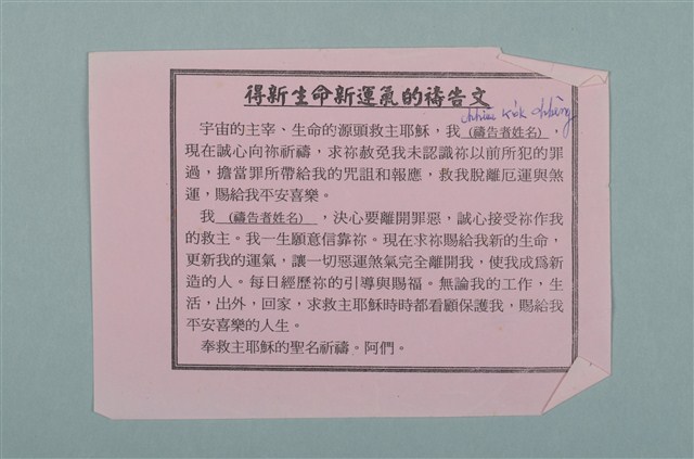 對於跨越過日本時代的人們,日常使用殖民母國的日語,家中則是使用台語,而戰後則因政府規定使用普通話(中文),我們可以從陳蕭女士的聖經當中看出三種語言的並存。無論是主日牧師講道的信息重點、或者主日學的註解筆記,都可以看到這三種語言的混雜軌跡。而三張名片,分別是陳蕭菊松女士個人名片,以及日本商店的入店證明。
