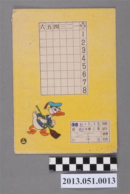 本作業簿印有空白欄位,提供學生課後練習課文單字。觀察內頁的單字,可能是1962年修訂的「國民學校國語課程標準」的小學三年級下學期國語課本(修訂暫用本第6冊),目前判讀出第七到八課的內容,因此本作業簿年代推測為1969-1978。全本作業簿皆鉛筆書寫痕跡且有缺頁。署名為「第三學年美術組、學號25、周沛任」、教師欄則寫有「黃女光士枝」。