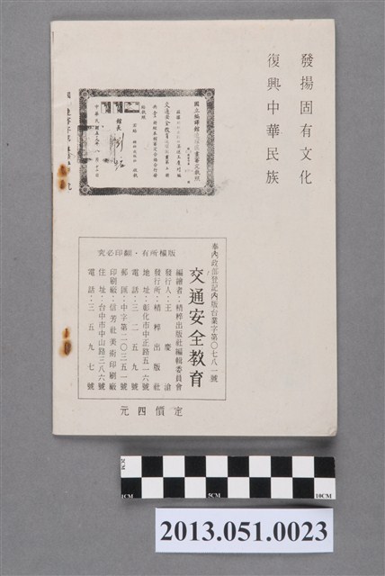本交通安全教育手冊,由精粹出版社編繪,經國立編譯館審定出品。提供學生乘車、騎腳踏車等交通安全守則觀念,為學校生活教育輔助教材。