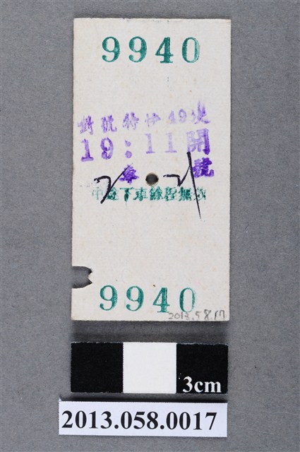 此組物件為民國59年12月6日至民國61年7月8日,宜蘭地區之間往來以及宜蘭地區至台北的火車票根,共計13張。此些地域的往來包含宜蘭、羅東、頭城、礁溪以及台北等地,而票根的背後,印有「保密防諜,人人有責」、「建設台灣,光復大陸」、「打回大陸,解救同胞」、「排隊買票,順序上車」以及「中途下車,餘程無效」等字樣,顯現出濃烈的國家反共氛圍以及民眾的社會秩序仍有待改善的特殊社會情境,故建議列為第三級藏品。