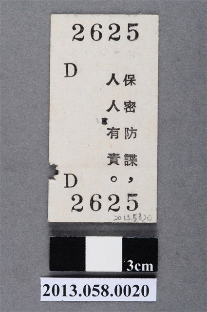此物件為宜蘭至頭城的火車票根,票根背後印有「保密防諜,人人有責」之標語。推測票根正面上方的年份顯示,應有可能為「60」誤印為「60」,日期則為7月12日。