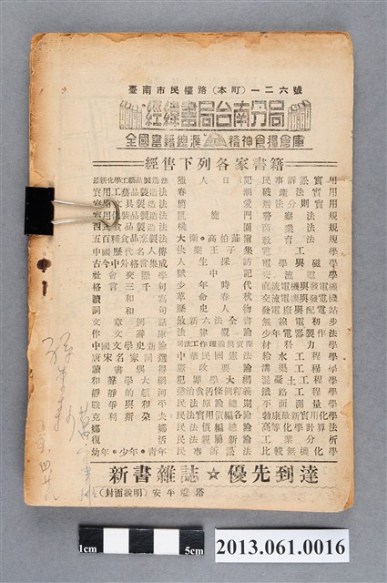 此物件為臺南導遊出版社,於1949年編印之書籍。本書內容先是概述臺灣歷史的發展,爾後再分別介紹臺南市的簡史、氣象、教育、交通、特產及名勝古蹟等各種層面,並附有臺南市各重要機關、旅館、飲食店、戲院的地址及聯絡方式,且在書籍封底列有簡單的臺南市市街圖。