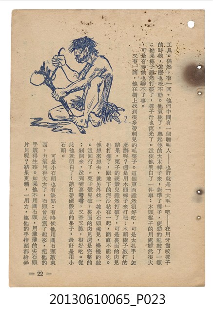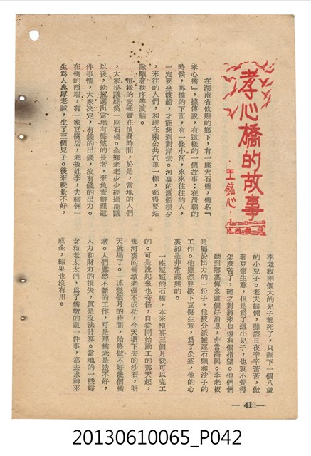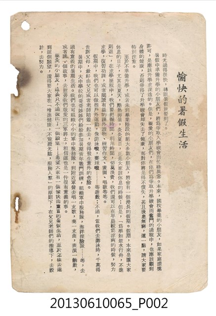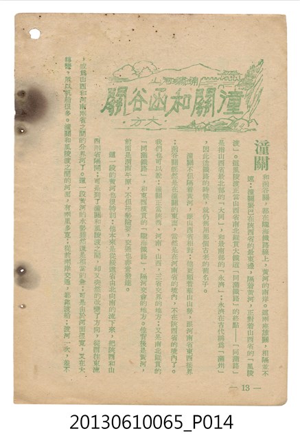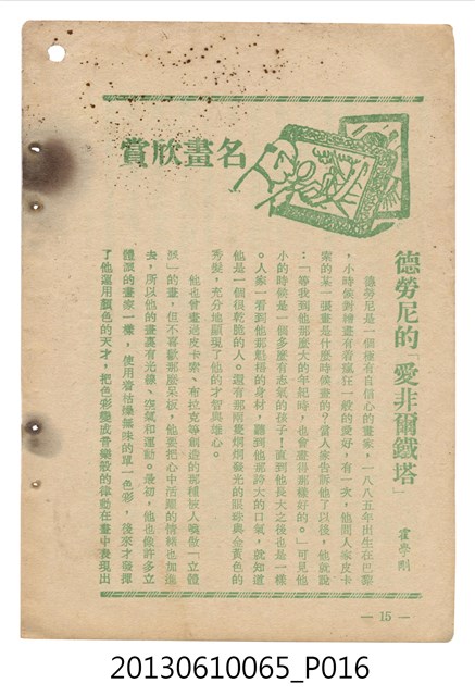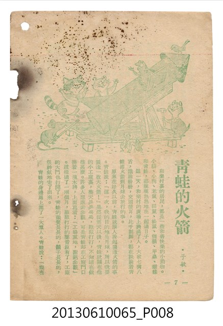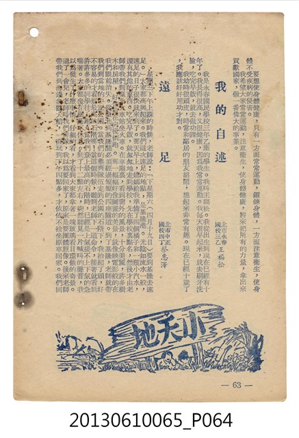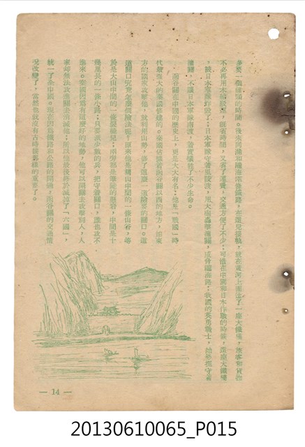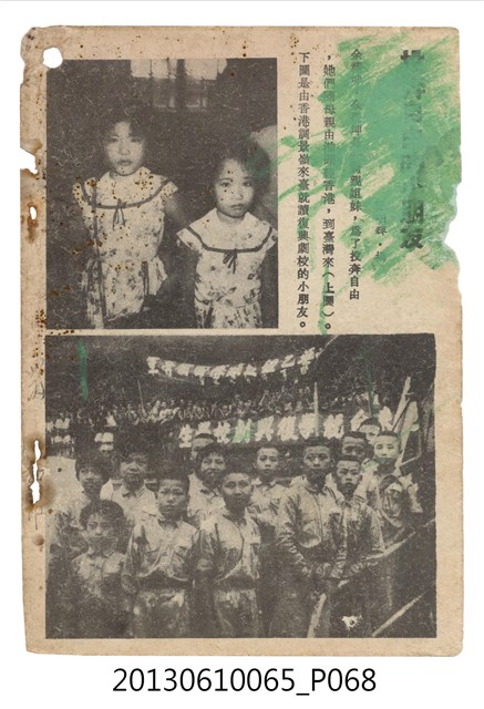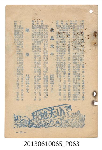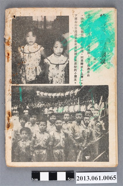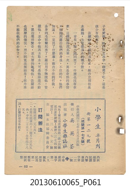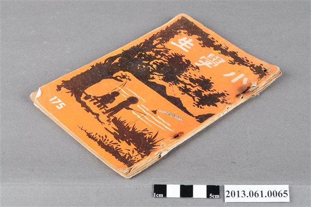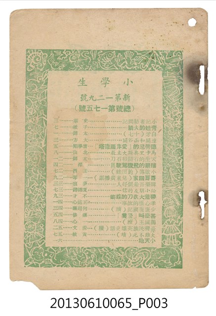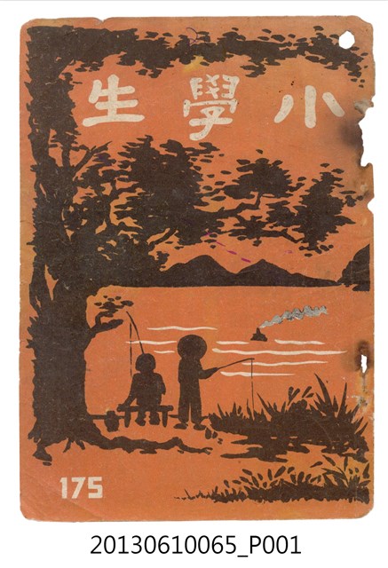《小學生》由臺灣省政府教育廳於1951年3月20日創刊,採半月刊形式,每月5日、20日為發行日,至1966年停刊。內容包含童話、故事、小說、語文學習、科學、常識、史地、圖畫、兒歌、人物介紹、新書介紹,等各類專欄,也有提供兒童創作的「小天地」。紀錄了1950、1960年代部分社會情狀以及兒童生活。館藏自1957年9月到1966年6月間之《小學生》,計127冊(本案125件,另有館藏2013.014.0003、2013.014.0004等2件),約佔總刊數394之32%。均為32開本,採書訂包裝,封面為彩色印刷,內文為黑、藍、橘、紅間用之單色印刷。於1961年8月以前每期64頁,每本2.5元;自1961年9月起每期96頁,每本4.5元。本件為小學生雜誌社出版《小學生》175號(新第129號)。封面為橘色底色,並以深色線描繪兩人在湖邊垂釣的風景。內容有〈德勞尼的愛菲爾鐵塔〉、〈馬卡里奧斯大主教〉、〈少康復國記〉、〈臺灣民族英雄史話〉等人物傳記、歷史故事及其他文章。封底為隨母親由汕頭經香港來臺、以及由香港吊景嶺來臺就讀復興劇校的小朋友攝影。