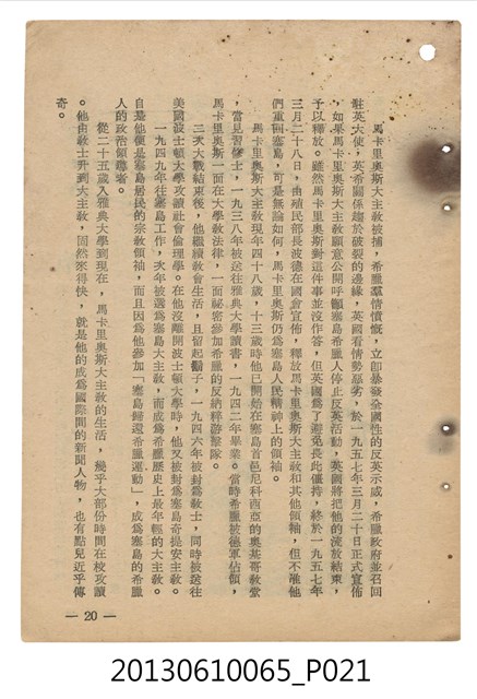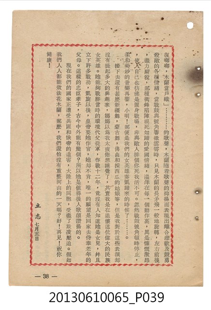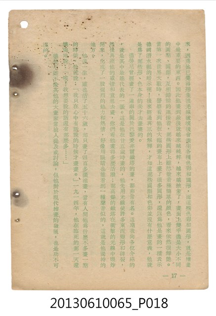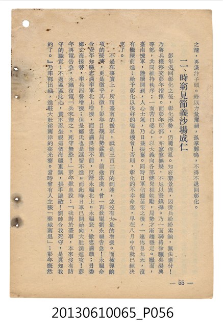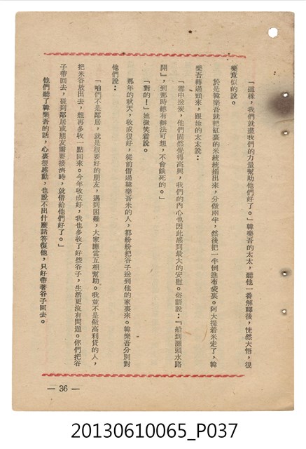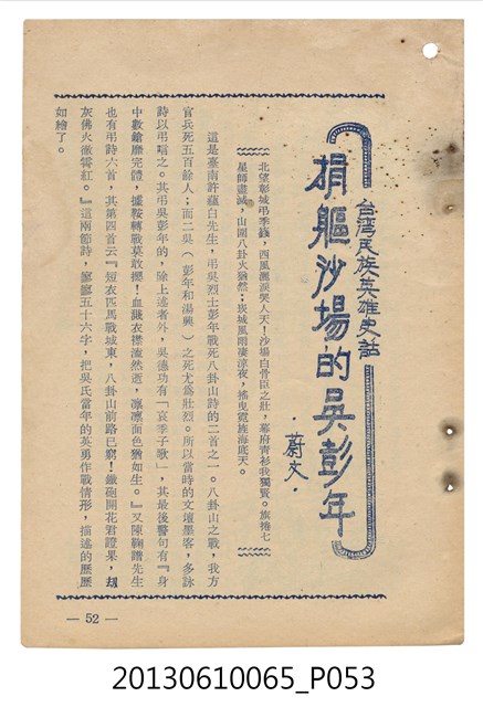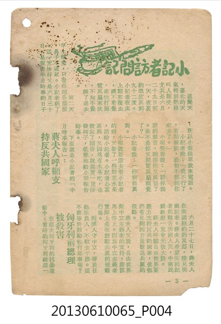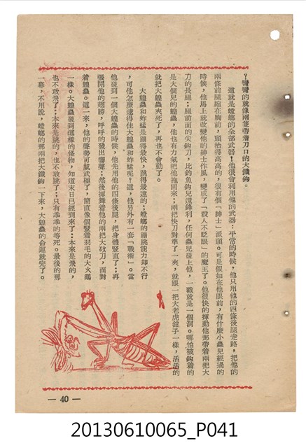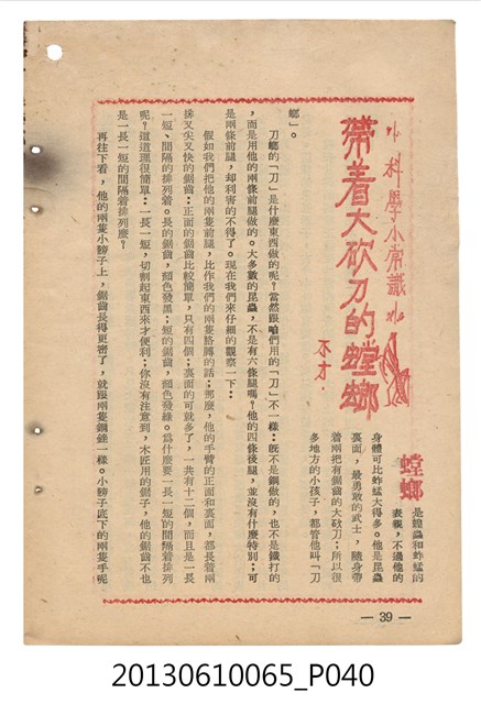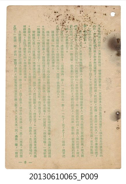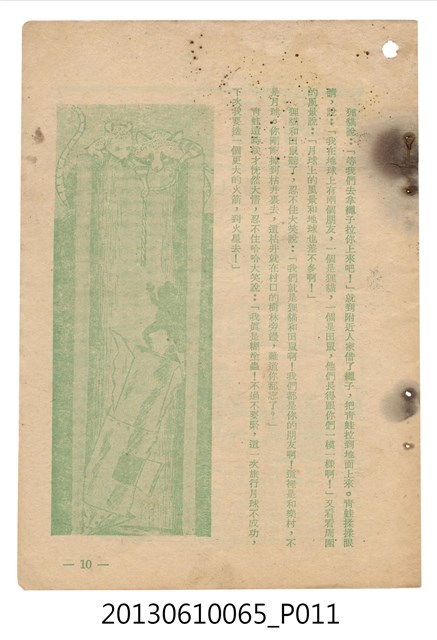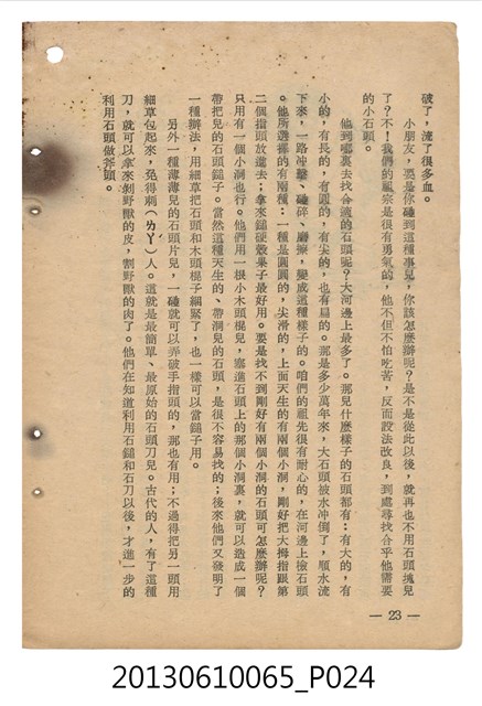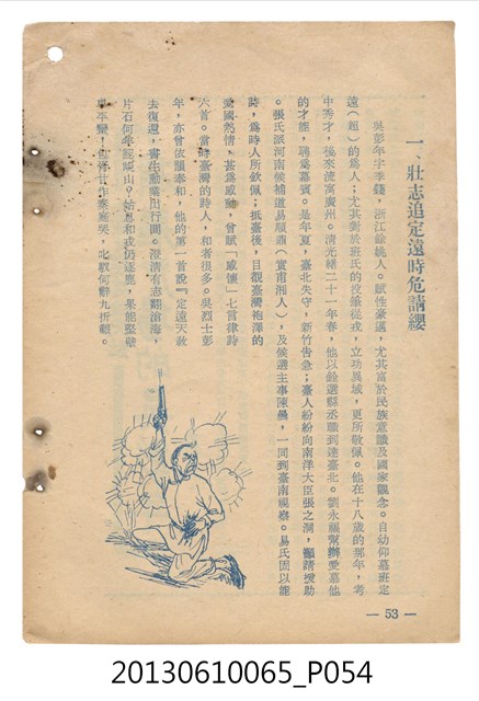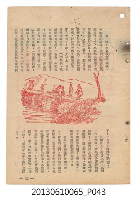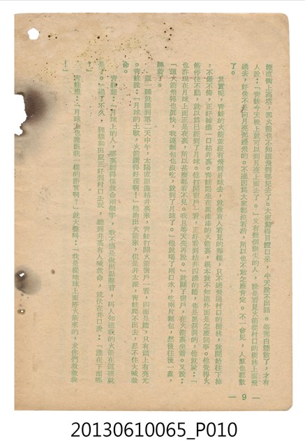 《小學生》由臺灣省政府教育廳於1951年3月20日創刊,採半月刊形式,每月5日、20日為發行日,至1966年停刊。內容包含童話、故事、小說、語文學習、科學、常識、史地、圖畫、兒歌、人物介紹、新書介紹,等各類專欄,也有提供兒童創作的「小天地」。紀錄了1950、1960年代部分社會情狀以及兒童生活。館藏自1957年9月到1966年6月間之《小學生》,計127冊(本案125件,另有館藏2013.014.0003、2013.014.0004等2件),約佔總刊數394之32%。均為32開本,採書訂包裝,封面為彩色印刷,內文為黑、藍、橘、紅間用之單色印刷。於1961年8月以前每期64頁,每本2.5元;自1961年9月起每期96頁,每本4.5元。本件為小學生雜誌社出版《小學生》175號(新第129號)。封面為橘色底色,並以深色線描繪兩人在湖邊垂釣的風景。內容有〈德勞尼的愛菲爾鐵塔〉、〈馬卡里奧斯大主教〉、〈少康復國記〉、〈臺灣民族英雄史話〉等人物傳記、歷史故事及其他文章。封底為隨母親由汕頭經香港來臺、以及由香港吊景嶺來臺就讀復興劇校的小朋友攝影。