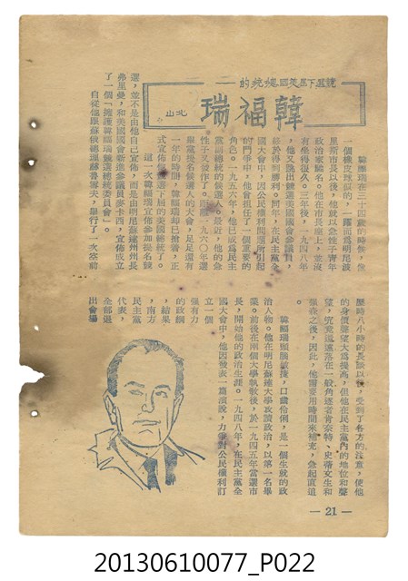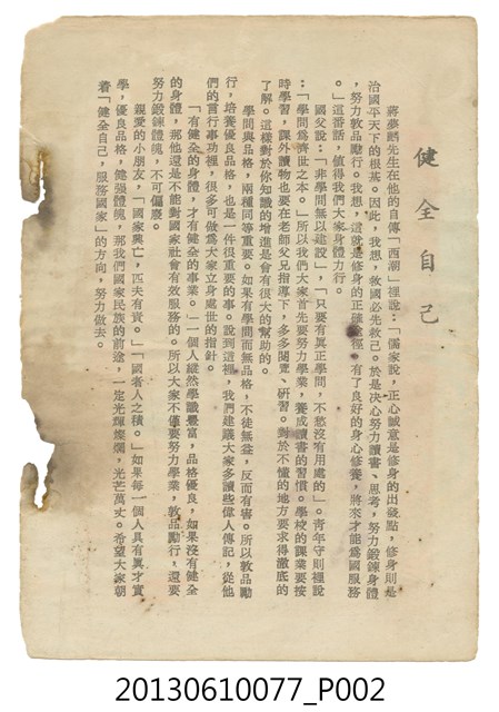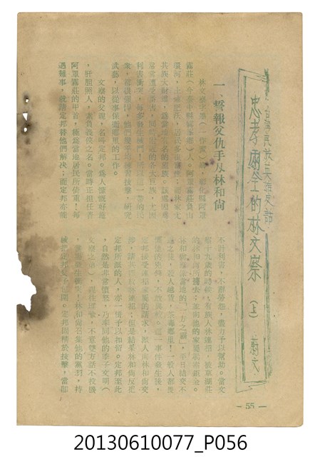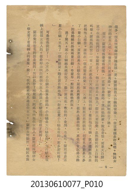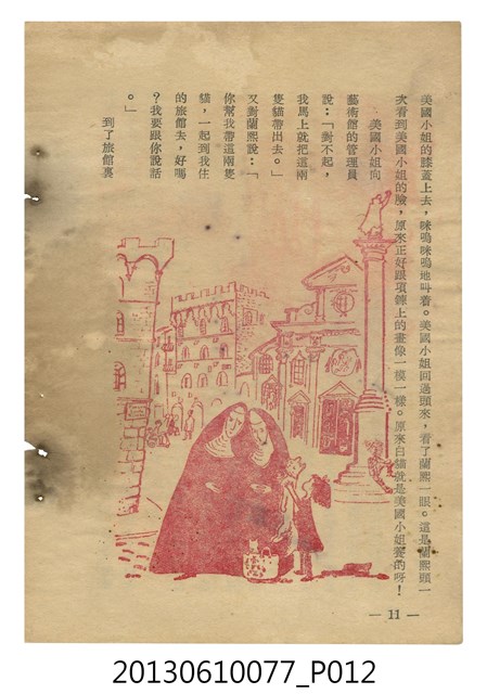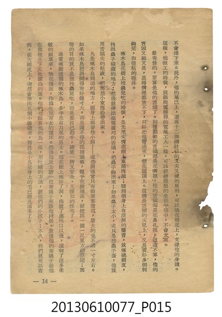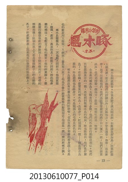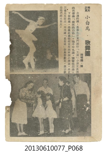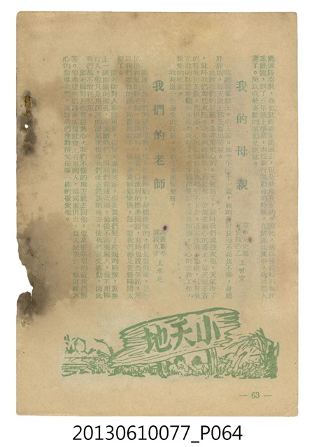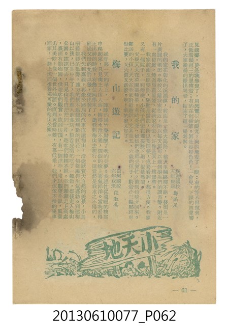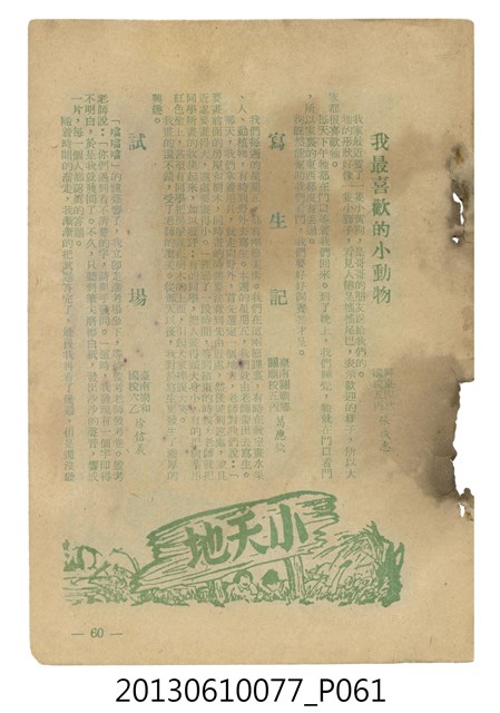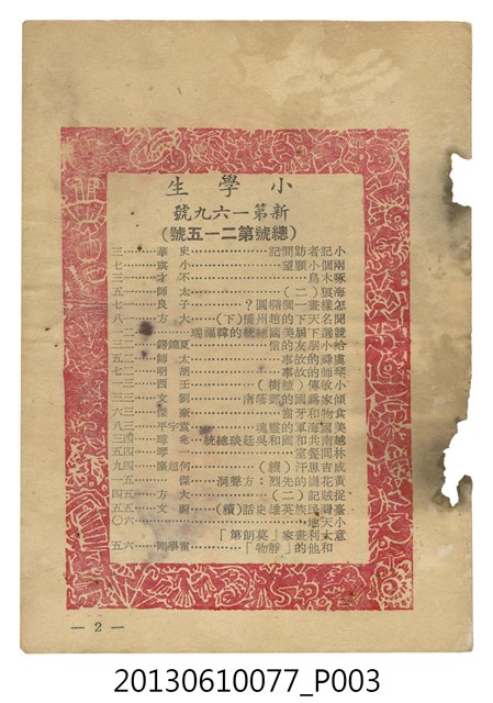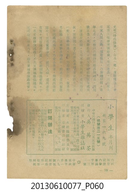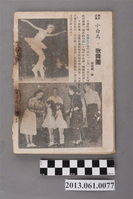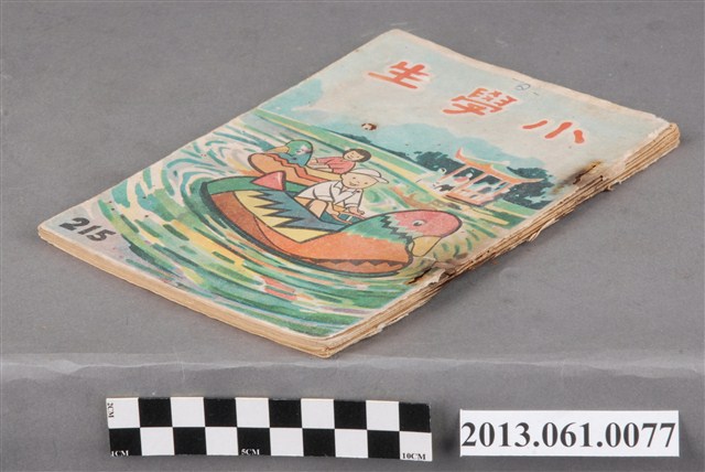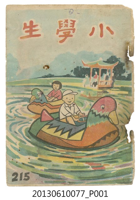 《小學生》由臺灣省政府教育廳於1951年3月20日創刊,採半月刊形式,每月5日、20日為發行日,至1966年停刊。內容包含童話、故事、小說、語文學習、科學、常識、史地、圖畫、兒歌、人物介紹、新書介紹,等各類專欄,也有提供兒童創作的「小天地」。紀錄了1950、1960年代部分社會情狀以及兒童生活。館藏自1957年9月到1966年6月間之《小學生》,計127冊(本案125件,另有館藏2013.014.0003、2013.014.0004等2件),約佔總刊數394之32%。均為32開本,採書訂包裝,封面為彩色印刷,內文為黑、藍、橘、紅間用之單色印刷。於1961年8月以前每期64頁,每本2.5元;自1961年9月起每期96頁,每本4.5元。本件為小學生雜誌社出版《小學生》215號(新第169號)。封面為兩個小朋友在湖面分別搭乘鴛鴦造型的小船,遠方則有涼亭。內容有〈競選下屆美國總統的韓福瑞〉、〈虞舜的故事〉、〈傾家為國的鄧蔭南〉、〈越南共和國和吳廷琰總統〉等人物傳記、歷史故事及其他文章。封底為表演芭蕾舞、以及向美國歌舞團獻花的小朋友攝影。