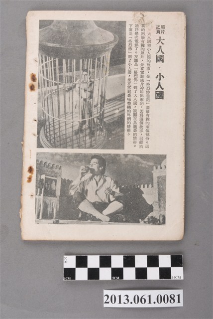 《小學生》由臺灣省政府教育廳於1951年3月20日創刊,採半月刊形式,每月5日、20日為發行日,至1966年停刊。內容包含童話、故事、小說、語文學習、科學、常識、史地、圖畫、兒歌、人物介紹、新書介紹,等各類專欄,也有提供兒童創作的「小天地」。紀錄了1950、1960年代部分社會情狀以及兒童生活。館藏自1957年9月到1966年6月間之《小學生》,計127冊(本案125件,另有館藏2013.014.0003、2013.014.0004等2件),約佔總刊數394之32%。均為32開本,採書訂包裝,封面為彩色印刷,內文為黑、藍、橘、紅間用之單色印刷。於1961年8月以前每期64頁,每本2.5元;自1961年9月起每期96頁,每本4.5元。本件為小學生雜誌社出版《小學生》232號(新第186號),缺封面。內容有〈美國新任駐聯合國代表:伍茲幄斯〉、〈香妃的故事〉、〈韓信佈背水陣〉、〈林肯的少年時代〉等人物傳記、歷史故事及其他文章。封底為格列佛遊記電影中的大人國、小人國的攝影。