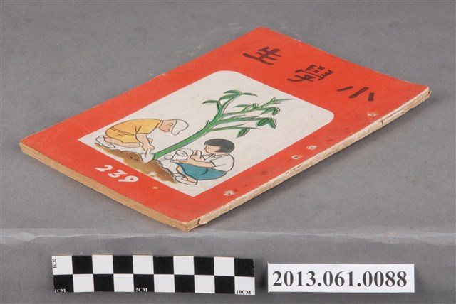 《小學生》由臺灣省政府教育廳於1951年3月20日創刊,採半月刊形式,每月5日、20日為發行日,至1966年停刊。內容包含童話、故事、小說、語文學習、科學、常識、史地、圖畫、兒歌、人物介紹、新書介紹,等各類專欄,也有提供兒童創作的「小天地」。紀錄了1950、1960年代部分社會情狀以及兒童生活。館藏自1957年9月到1966年6月間之《小學生》,計127冊(本案125件,另有館藏2013.014.0003、2013.014.0004等2件),約佔總刊數394之32%。均為32開本,採書訂包裝,封面為彩色印刷,內文為黑、藍、橘、紅間用之單色印刷。於1961年8月以前每期64頁,每本2.5元;自1961年9月起每期96頁,每本4.5元。本件為小學生雜誌社出版《小學生》239號(新第193號)。封面為兩個正在植樹、澆水的兒童圖繪。內容有〈貝多芬的的幾首著名交響曲〉、〈明朝的十三陵〉、〈美國的新任國防部長:麥納瑪拉〉、〈國父在南洋〉、〈忠義不屈的黃道周〉等人物傳記、歷史故事及其他文章。封底為正在疊羅漢的華興育幼院小朋友、以及華興育幼院向玻利維亞副總統雷欽夫人獻花的攝影。
