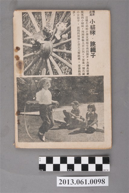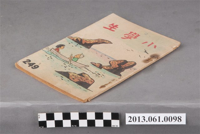 《小學生》由臺灣省政府教育廳於1951年3月20日創刊,採半月刊形式,每月5日、20日為發行日,至1966年停刊。內容包含童話、故事、小說、語文學習、科學、常識、史地、圖畫、兒歌、人物介紹、新書介紹,等各類專欄,也有提供兒童創作的「小天地」。紀錄了1950、1960年代部分社會情狀以及兒童生活。館藏自1957年9月到1966年6月間之《小學生》,計127冊(本案125件,另有館藏2013.014.0003、2013.014.0004等2件),約佔總刊數394之32%。均為32開本,採書訂包裝,封面為彩色印刷,內文為黑、藍、橘、紅間用之單色印刷。於1961年8月以前每期64頁,每本2.5元;自1961年9月起每期96頁,每本4.5元。本件為小學生雜誌社出版《小學生》249號(新第203號)。封面為兩個小朋友在礁岸間划著小船的圖繪。內容有〈蕭邦的演奏〉、〈晉文公開始逃亡〉、〈秘魯總統:浦樂多〉、〈韓信拜將〉等人物傳記、歷史故事及其他文章。封底為跳到車軸上的貓咪、以及比賽跳繩的小朋友攝影。