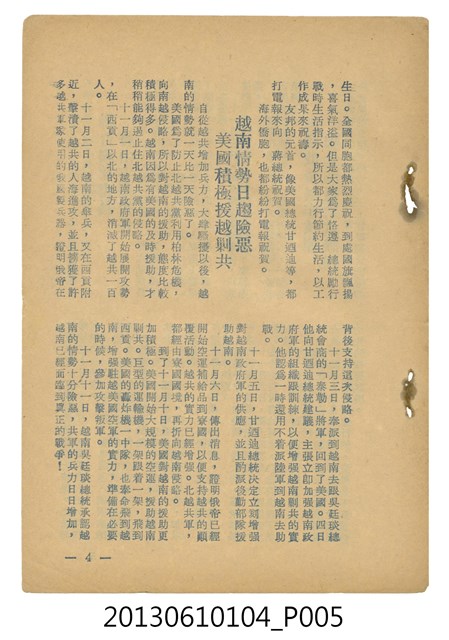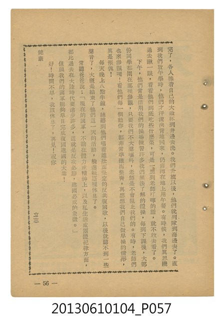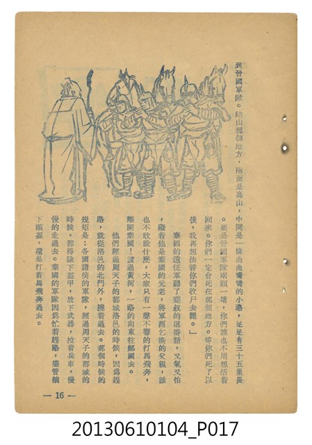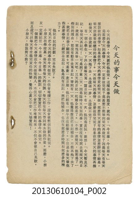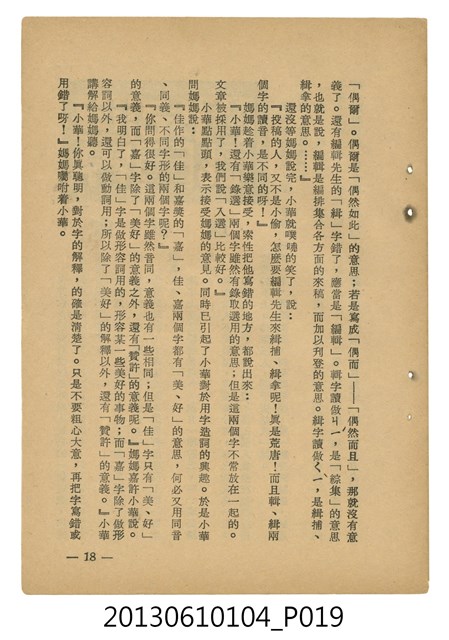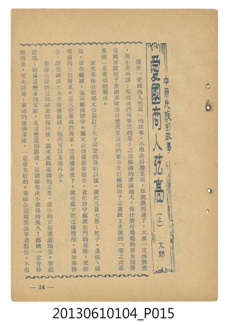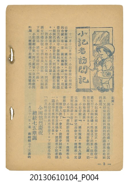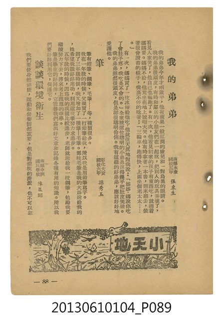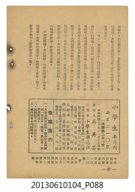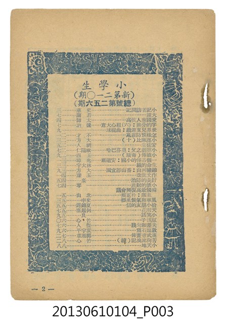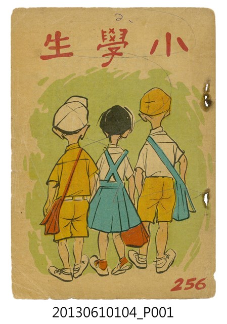 《小學生》由臺灣省政府教育廳於1951年3月20日創刊,採半月刊形式,每月5日、20日為發行日,至1966年停刊。內容包含童話、故事、小說、語文學習、科學、常識、史地、圖畫、兒歌、人物介紹、新書介紹,等各類專欄,也有提供兒童創作的「小天地」。紀錄了1950、1960年代部分社會情狀以及兒童生活。館藏自1957年9月到1966年6月間之《小學生》,計127冊(本案125件,另有館藏2013.014.0003、2013.014.0004等2件),約佔總刊數394之32%。均為32開本,採書訂包裝,封面為彩色印刷,內文為黑、藍、橘、紅間用之單色印刷。於1961年8月以前每期64頁,每本2.5元;自1961年9月起每期96頁,每本4.5元。本件為小學生雜誌社出版《小學生》256號(新第210號)。封面為三個揹著書包的學生背影圖繪。內容有〈愛國商人弦高〉、〈小歌劇之父:奧芬巴哈〉、〈韓國最高復興會議主席:朴正熙〉、〈夫差和勾踐〉等人物傳記、歷史故事及其他文章。本件缺封底。