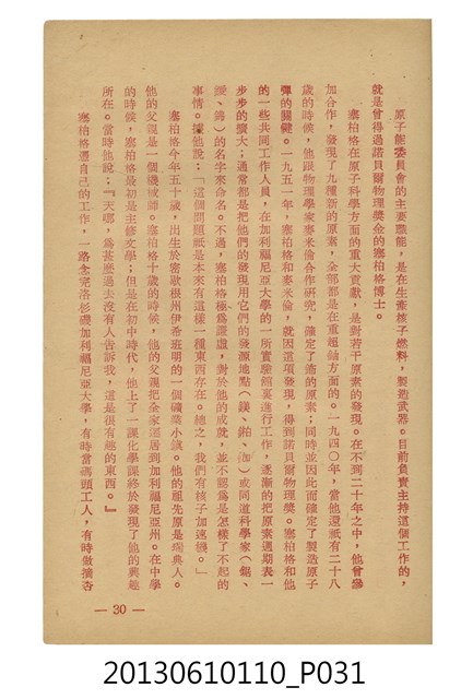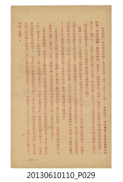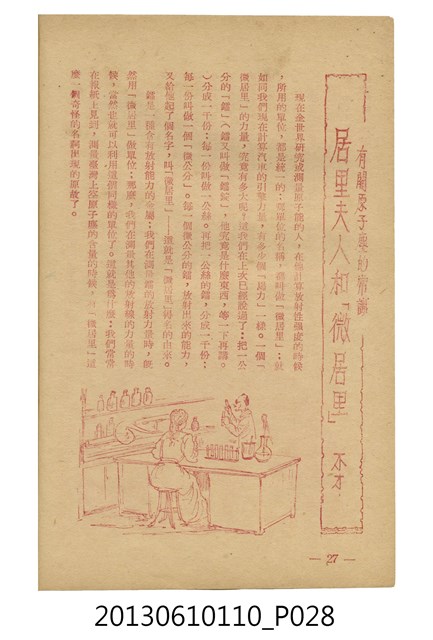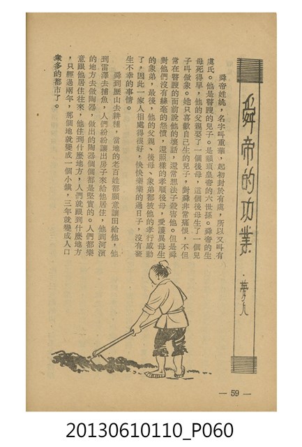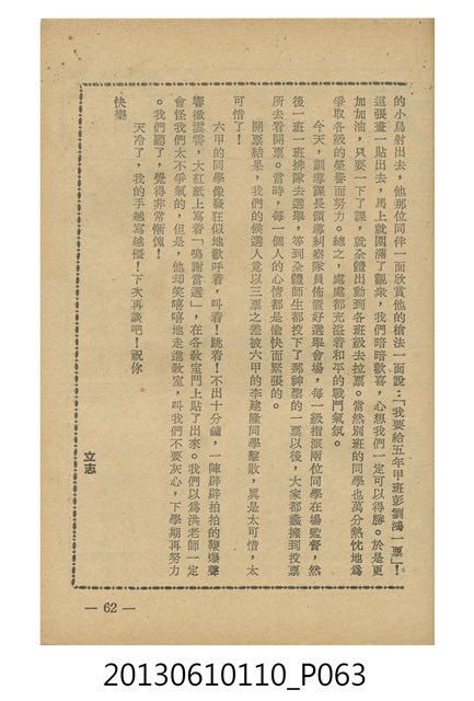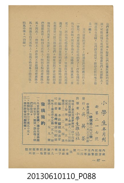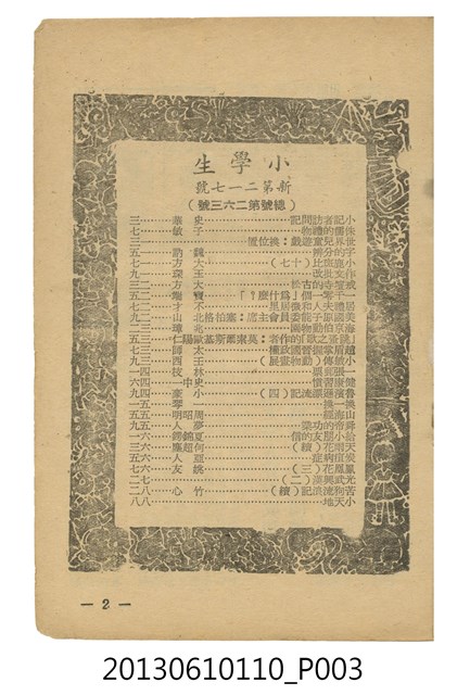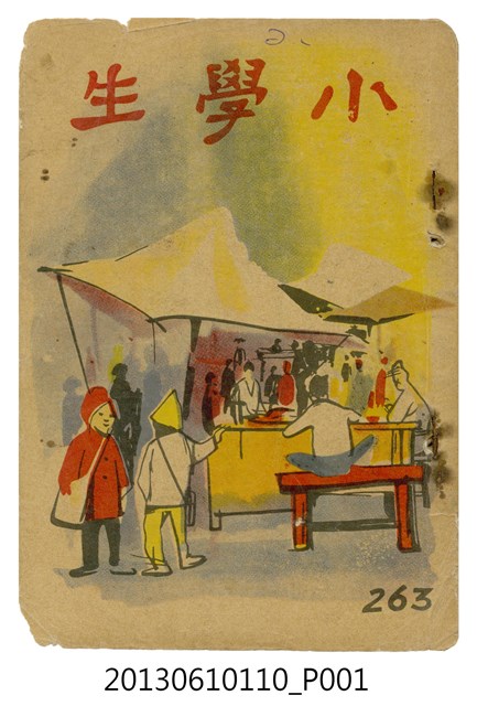 《小學生》由臺灣省政府教育廳於1951年3月20日創刊,採半月刊形式,每月5日、20日為發行日,至1966年停刊。內容包含童話、故事、小說、語文學習、科學、常識、史地、圖畫、兒歌、人物介紹、新書介紹,等各類專欄,也有提供兒童創作的「小天地」。紀錄了1950、1960年代部分社會情狀以及兒童生活。館藏自1957年9月到1966年6月間之《小學生》,計127冊(本案125件,另有館藏2013.014.0003、2013.014.0004等2件),約佔總刊數394之32%。均為32開本,採書訂包裝,封面為彩色印刷,內文為黑、藍、橘、紅間用之單色印刷。於1961年8月以前每期64頁,每本2.5元;自1961年9月起每期96頁,每本4.5元。本件為小學生雜誌社出版《小學生》263號(新第217號)。封面為市場或攤販的圖繪。內容有〈居里夫人和微居里〉、〈美國原子能委員會主席:賽柏格〉、〈跳蚤之歌的作者:莫索爾斯基〉、〈趙盾掌握晉國政權〉等人物傳記、歷史故事及其他文章。封底為高雄大社國校學生學作雞蛋糕、及唱歌的攝影。