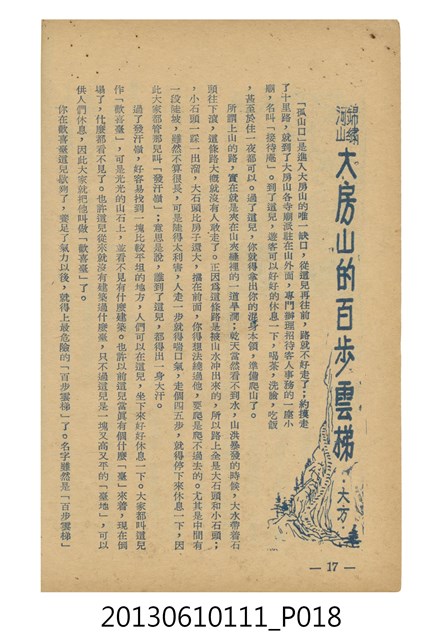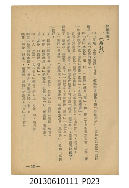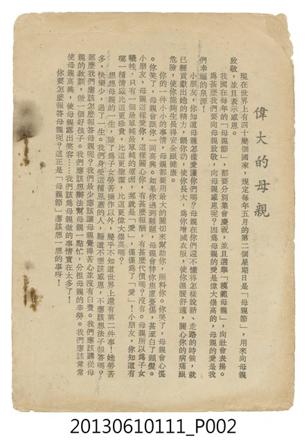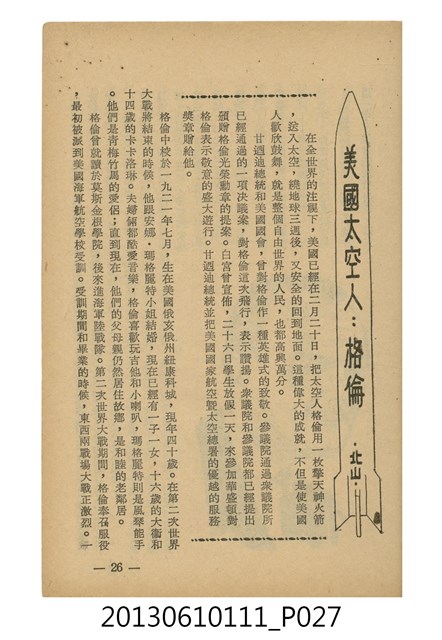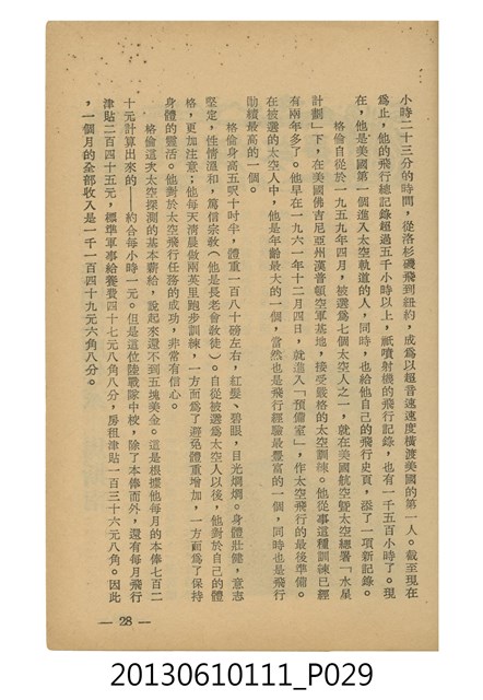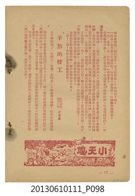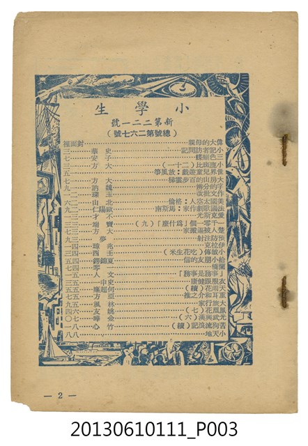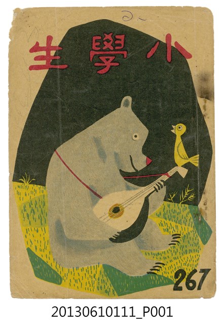 《小學生》由臺灣省政府教育廳於1951年3月20日創刊,採半月刊形式,每月5日、20日為發行日,至1966年停刊。內容包含童話、故事、小說、語文學習、科學、常識、史地、圖畫、兒歌、人物介紹、新書介紹,等各類專欄,也有提供兒童創作的「小天地」。紀錄了1950、1960年代部分社會情狀以及兒童生活。館藏自1957年9月到1966年6月間之《小學生》,計127冊(本案125件,另有館藏2013.014.0003、2013.014.0004等2件),約佔總刊數394之32%。均為32開本,採書訂包裝,封面為彩色印刷,內文為黑、藍、橘、紅間用之單色印刷。於1961年8月以前每期64頁,每本2.5元;自1961年9月起每期96頁,每本4.5元。本件為小學生雜誌社出版《小學生》267號(新第221號)。封面為彈奏著樂器的熊及站在樂器上的鳥的圖繪。內容有〈美國太空人:格倫〉、〈法國歌劇作家:馬斯南〉、〈重耳和介之推〉、〈光武興漢〉等人物傳記、歷史故事及其他文章。封底為小朋友寫生和野餐的攝影。