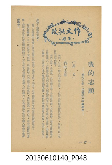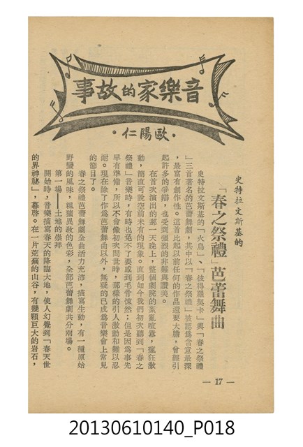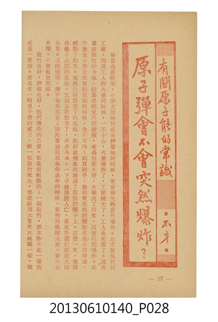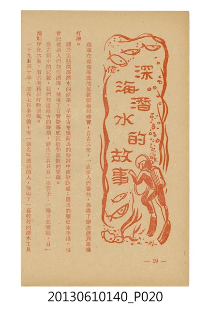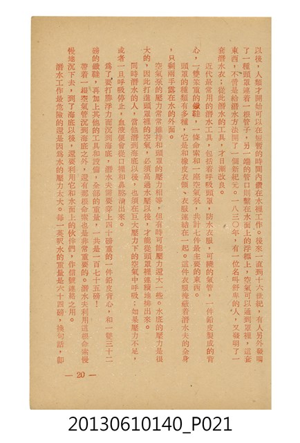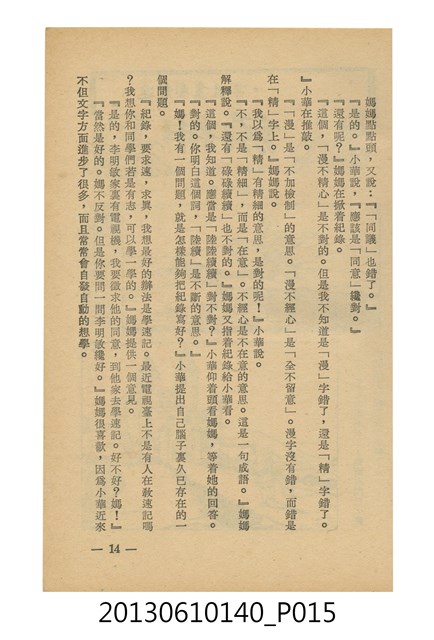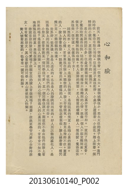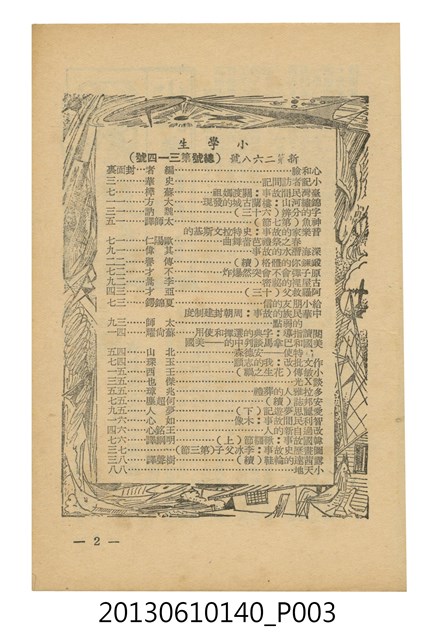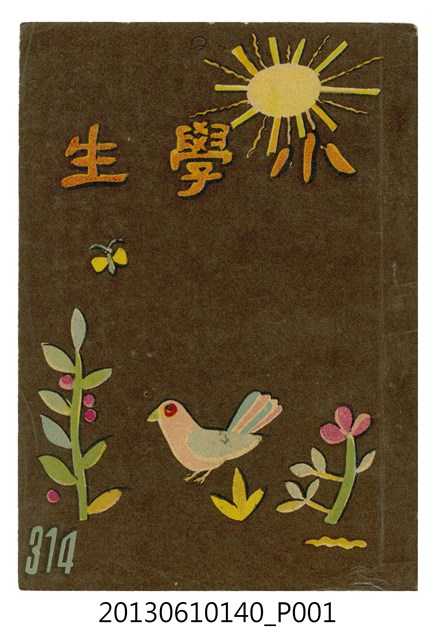 《小學生》由臺灣省政府教育廳於1951年3月20日創刊,採半月刊形式,每月5日、20日為發行日,至1966年停刊。內容包含童話、故事、小說、語文學習、科學、常識、史地、圖畫、兒歌、人物介紹、新書介紹,等各類專欄,也有提供兒童創作的「小天地」。紀錄了1950、1960年代部分社會情狀以及兒童生活。館藏自1957年9月到1966年6月間之《小學生》,計127冊(本案125件,另有館藏2013.014.0003、2013.014.0004等2件),約佔總刊數394之32%。均為32開本,採書訂包裝,封面為彩色印刷,內文為黑、藍、橘、紅間用之單色印刷。於1961年8月以前每期64頁,每本2.5元;自1961年9月起每期96頁,每本4.5元。本件為小學生雜誌社出版《小學生》314號(新第268號)。封面為小鳥、花草與太陽的圖繪。內容有〈音樂家的故事:史特拉文斯基的春之祭禮芭蕾舞曲〉、〈周朝封建制度的弱點〉、〈美國和巴拿馬談判中的─美國特使:安德森〉、〈李冰父子〉等人物傳記、歷史故事及其他文章。封底為小學生叢書的訂購宣傳。