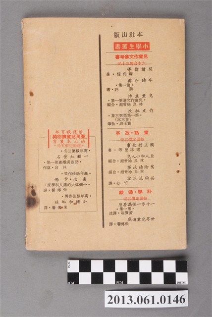 《小學生》由臺灣省政府教育廳於1951年3月20日創刊,採半月刊形式,每月5日、20日為發行日,至1966年停刊。內容包含童話、故事、小說、語文學習、科學、常識、史地、圖畫、兒歌、人物介紹、新書介紹,等各類專欄,也有提供兒童創作的「小天地」。紀錄了1950、1960年代部分社會情狀以及兒童生活。館藏自1957年9月到1966年6月間之《小學生》,計127冊(本案125件,另有館藏2013.014.0003、2013.014.0004等2件),約佔總刊數394之32%。均為32開本,採書訂包裝,封面為彩色印刷,內文為黑、藍、橘、紅間用之單色印刷。於1961年8月以前每期64頁,每本2.5元;自1961年9月起每期96頁,每本4.5元。本件為小學生雜誌社出版《小學生》321號(新第275號)。封面為一隻閉著眼、雙手環抱胸前、坐在水桶中的青蛙圖繪。內容有〈中興人物故事:勾踐滅吳〉、〈音樂家的故事:普勞柯菲夫的基傑少尉組曲〉、〈美國共和黨副總統候選人─米勒〉、〈百里奚五羊皮的故事〉等人物傳記、歷史故事及其他文章。封底為小學生叢書的訂購宣傳。