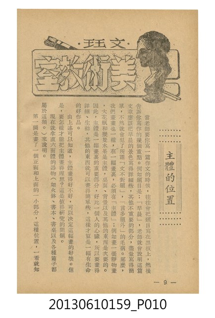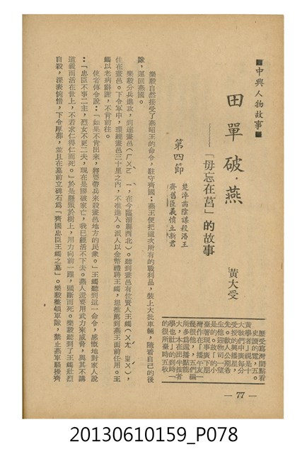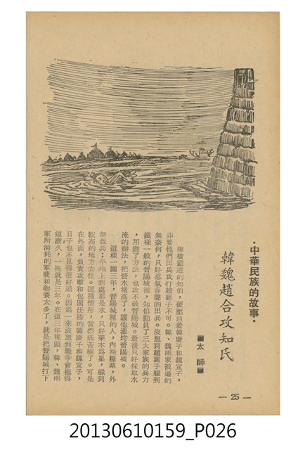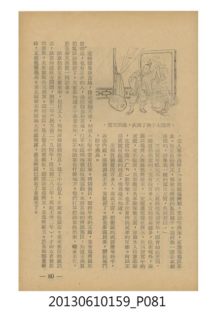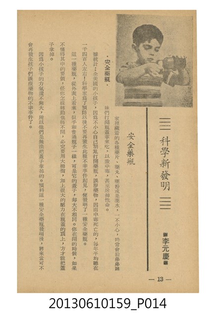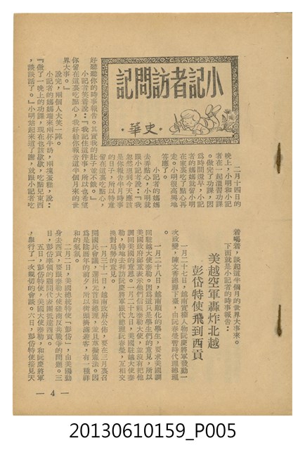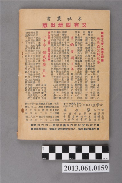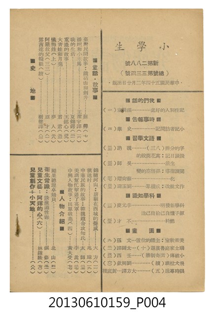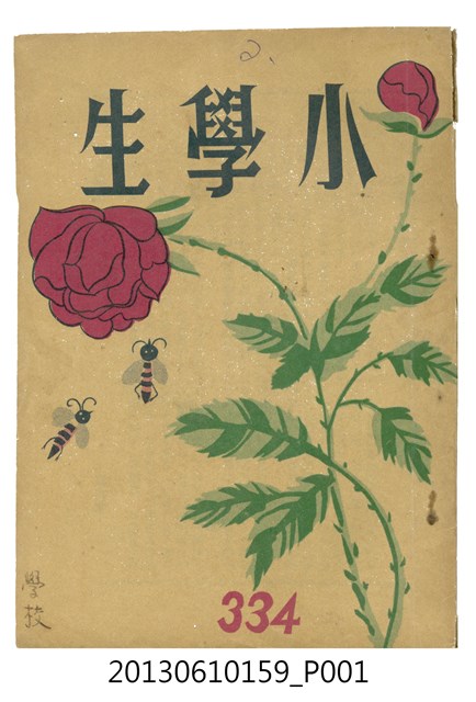 《小學生》由臺灣省政府教育廳於1951年3月20日創刊,採半月刊形式,每月5日、20日為發行日,至1966年停刊。內容包含童話、故事、小說、語文學習、科學、常識、史地、圖畫、兒歌、人物介紹、新書介紹,等各類專欄,也有提供兒童創作的「小天地」。紀錄了1950、1960年代部分社會情狀以及兒童生活。館藏自1957年9月到1966年6月間之《小學生》,計127冊(本案125件,另有館藏2013.014.0003、2013.014.0004等2件),約佔總刊數394之32%。均為32開本,採書訂包裝,封面為彩色印刷,內文為黑、藍、橘、紅間用之單色印刷。於1961年8月以前每期64頁,每本2.5元;自1961年9月起每期96頁,每本4.5元。本件為小學生雜誌社出版《小學生》334號(新第288號)。封面為花朵與蜜蜂的圖繪。內容有〈韓魏趙合攻知氏〉、〈美琪幫忙及退了英軍〉、〈田單破燕〉、〈剛果總理卓姆貝〉等人物傳記、歷史故事及其他文章。封底為小學生叢書的訂購宣傳。