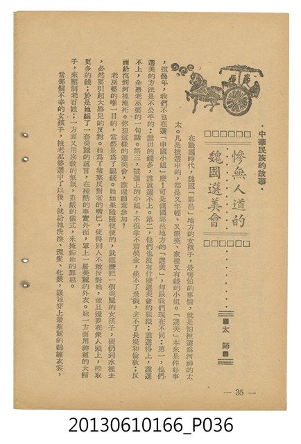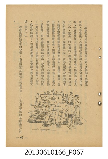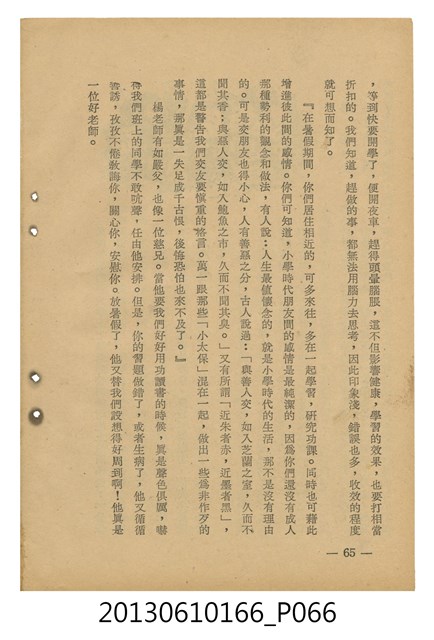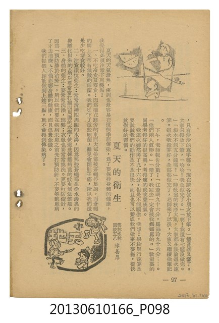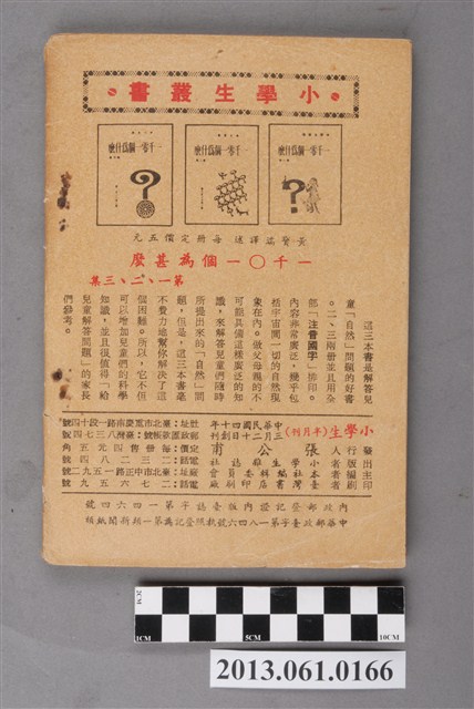 《小學生》由臺灣省政府教育廳於1951年3月20日創刊,採半月刊形式,每月5日、20日為發行日,至1966年停刊。內容包含童話、故事、小說、語文學習、科學、常識、史地、圖畫、兒歌、人物介紹、新書介紹,等各類專欄,也有提供兒童創作的「小天地」。紀錄了1950、1960年代部分社會情狀以及兒童生活。館藏自1957年9月到1966年6月間之《小學生》,計127冊(本案125件,另有館藏2013.014.0003、2013.014.0004等2件),約佔總刊數394之32%。均為32開本,採書訂包裝,封面為彩色印刷,內文為黑、藍、橘、紅間用之單色印刷。於1961年8月以前每期64頁,每本2.5元;自1961年9月起每期96頁,每本4.5元。本件為小學生雜誌社出版《小學生》344號(新第298號)。封面為小朋友圍著正在筆記本上寫著字的老師的圖繪。內容有〈臺灣民間故事:划水仙〉、〈慘無人道的魏國選美會〉等人物傳記、歷史故事及其他文章。封底為小學生叢書的訂購宣傳。