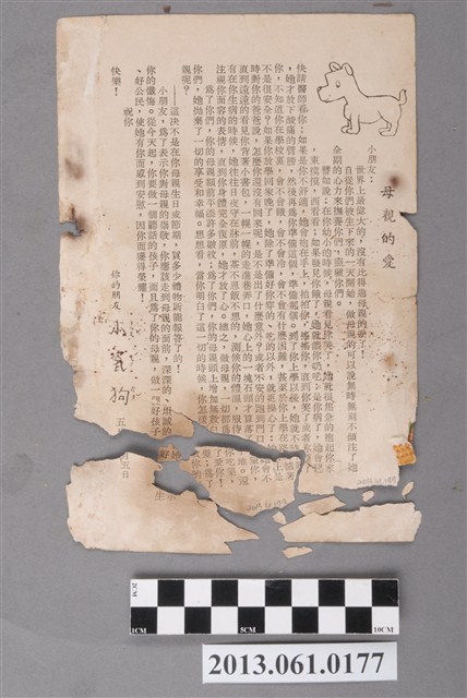 《小學生》由臺灣省政府教育廳於1951年3月20日創刊,採半月刊形式,每月5日、20日為發行日,至1966年停刊。內容包含童話、故事、小說、語文學習、科學、常識、史地、圖畫、兒歌、人物介紹、新書介紹,等各類專欄,也有提供兒童創作的「小天地」。紀錄了1950、1960年代部分社會情狀以及兒童生活。館藏自1957年9月到1966年6月間之《小學生》,計127冊(本案125件,另有館藏2013.014.0003、2013.014.0004等2件),約佔總刊數394之32%。均為32開本,採書訂包裝,封面為彩色印刷,內文為黑、藍、橘、紅間用之單色印刷。於1961年8月以前每期64頁,每本2.5元;自1961年9月起每期96頁,每本4.5元。本件僅為小學生雜誌社出版《小學生》363號(新第317號)之封面,內容均缺。封面為一個作成大鳥風箏般的稻草人被立在田中,驚嚇了麻雀和白兔的圖繪;背面則是雜誌社界小瓷狗之名,以母親的愛為題的刊頭語。