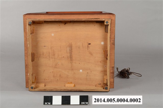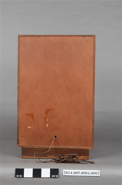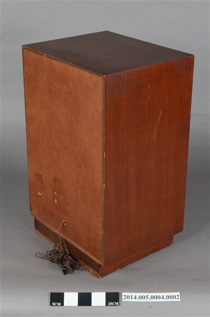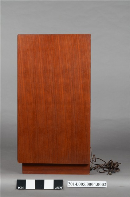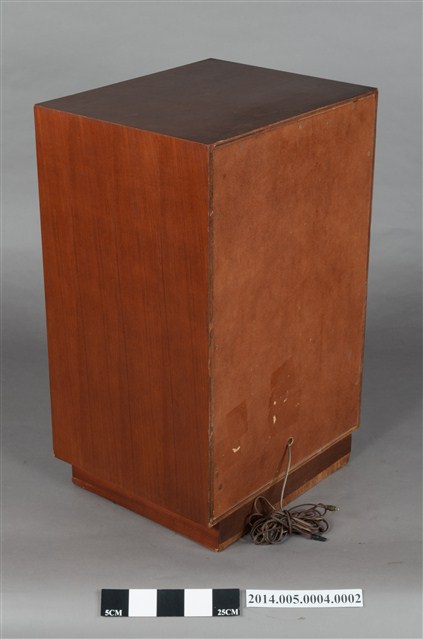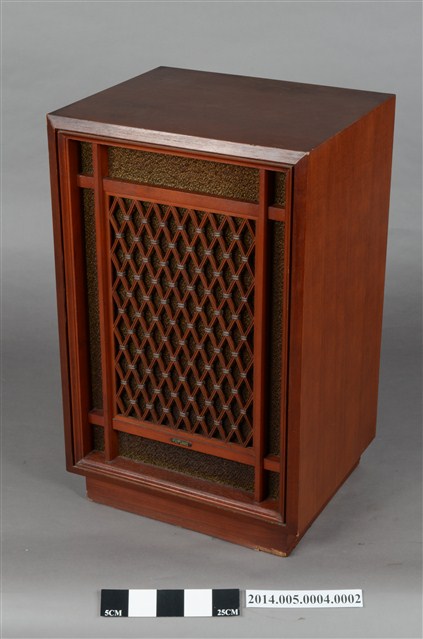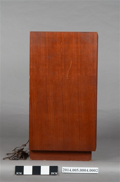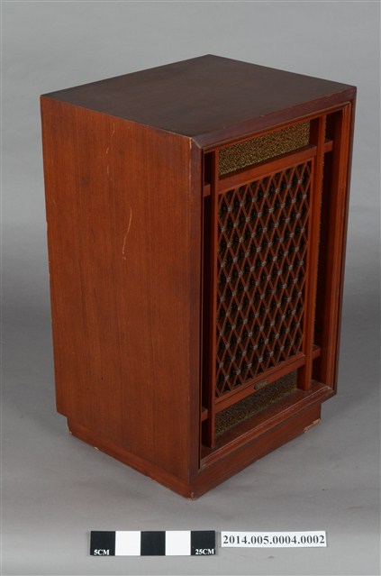 大同公司生產AFR-5001環繞式音響組左聲道喇叭,為落地式大型喇叭,木製箱型體,正面窗框作菱形紋雕花裝飾。