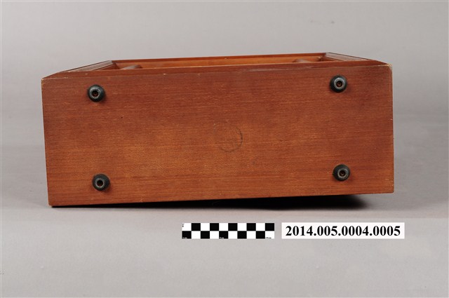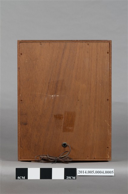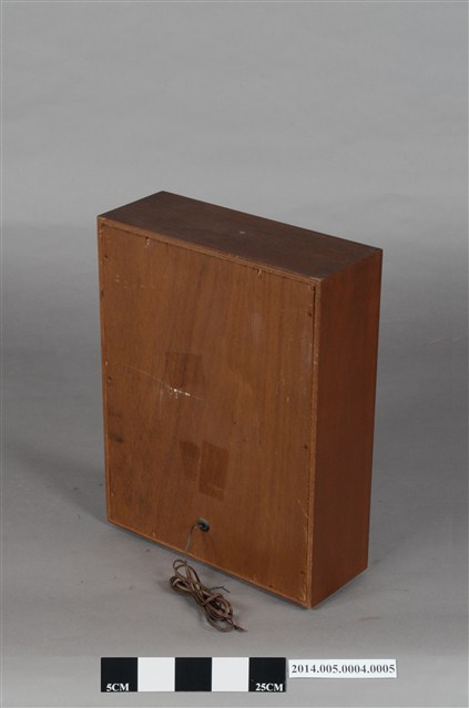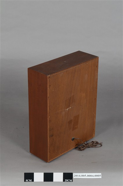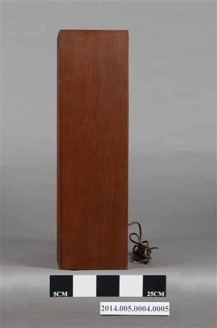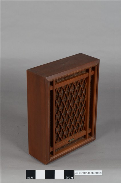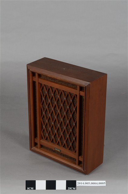 大同公司生產AFR-5001環繞式音響組環繞聲道喇叭,為離地式小型喇叭,木製箱型體,正面窗框作菱形紋雕花裝飾。