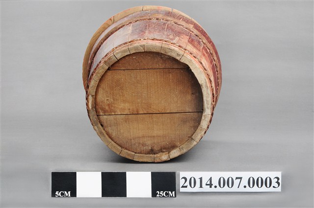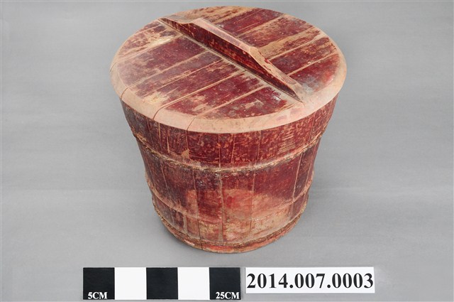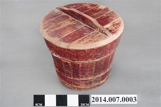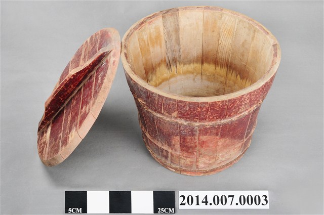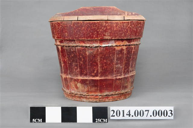 木製尿桶,有蓋,外表髹有紅漆,以數片木片箍成。尿桶又為子孫桶之一,平時為便器,生產時可用來裝盛產後穢物。此腰桶是姜沈稟婆婆新婚時所購買,外觀完整無嚴重破損,距今有六十年的歷史。