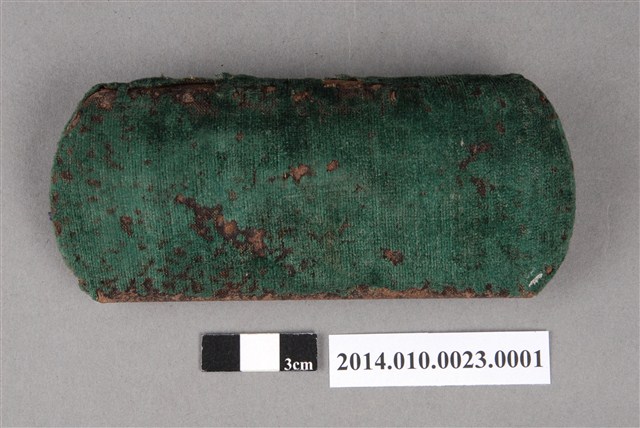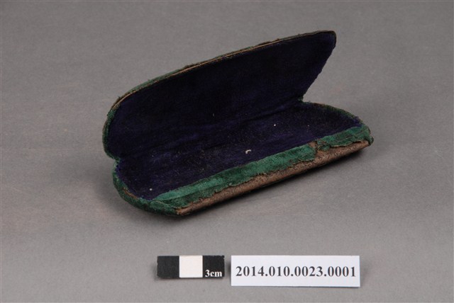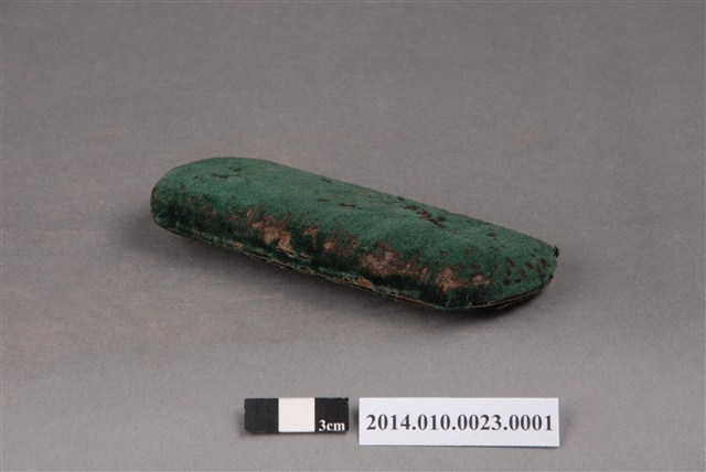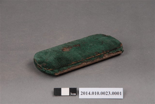 本物件為白金町眼鏡組中之眼鏡盒,鐵製,外面包覆綠色絨布,整體有些許髒污與磨損,且有多處已缺損。