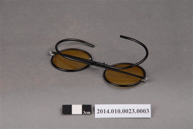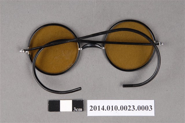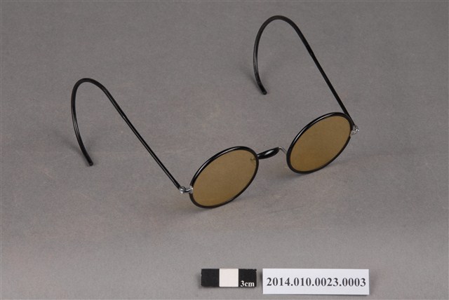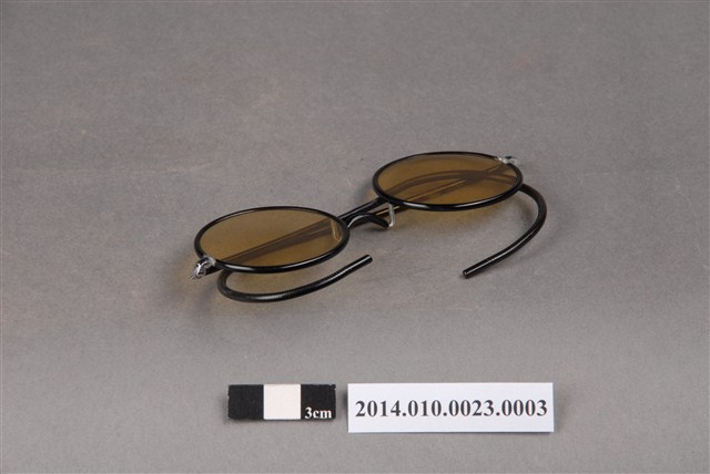 本物件為白金町眼鏡組中之眼鏡。外形為棕黃色圓形玻璃鏡片,黑色塑膠鏡框與鏡架。