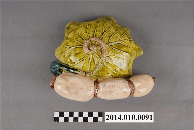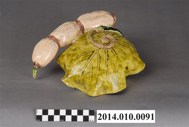 林添木作蓮藕交趾陶筆洗,造形式荷葉與蓮藕為主,取有吉祥的寓意。林添木(1911-1987)藝師為臺灣交趾陶開山祖師葉王的後代子弟;同時臺灣近代的交趾陶藝術創作名家諸如高枝明、蘇俊夫等人,多師承自林添木。臺灣的交趾陶有兩大源流:一為葉王所代表的潮州派,使用寶石釉,葉王的作品盛行於道光末至光緒年間;二為從光緒至民國初年的泉州派,以洪坤福一系為主,善於使用水彩釉。林添木先是師從蔡文董的水彩釉;爾後又從葉王的鄰居舊識黃得意,承襲葉王一派的製釉技術。另林添木又於日治時期,引進日本的「水塘」瓷質釉;且將臺灣的交趾陶從傳統的寺廟建築走向純創作。林添木於交趾陶的藝術創作場域,具有其