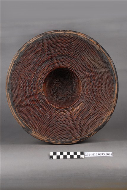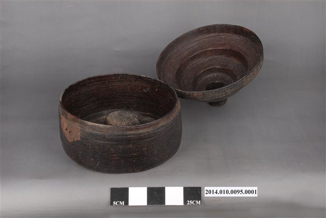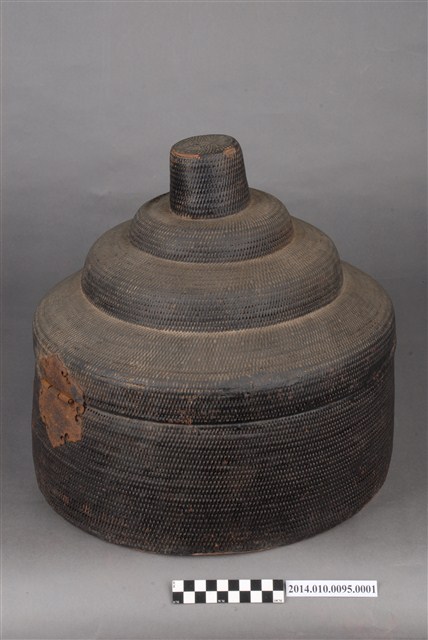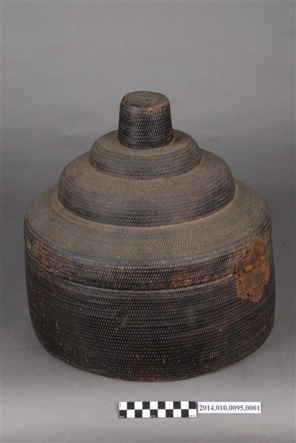 清代官帽箱。箱蓋依照官帽的形制,層疊凸起,以保護官帽,防止變形。並有金屬製的箱扣,箱扣造形仍完整,但已生鏽。