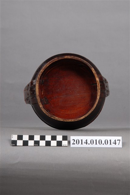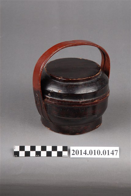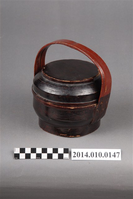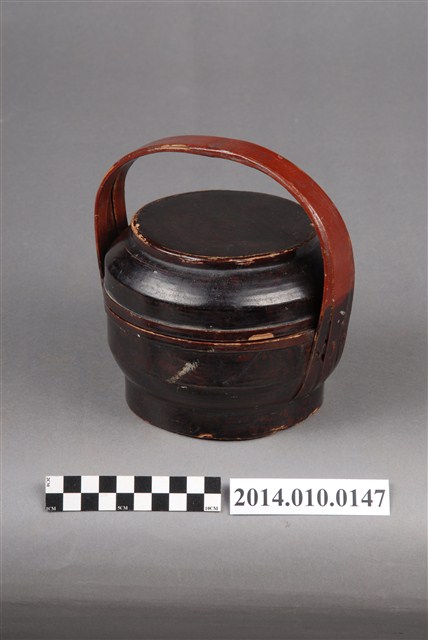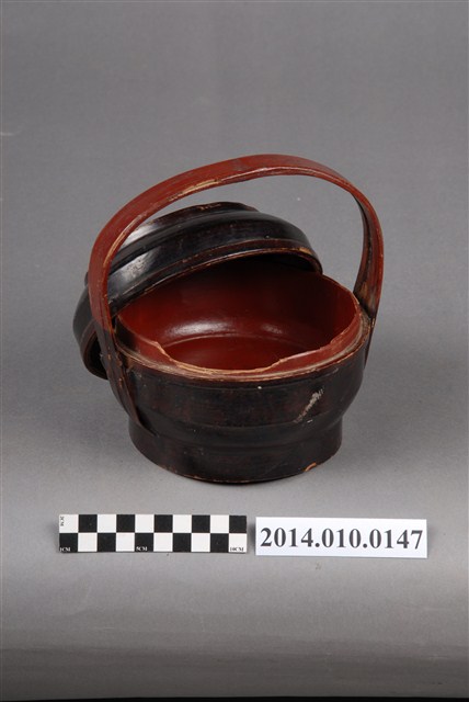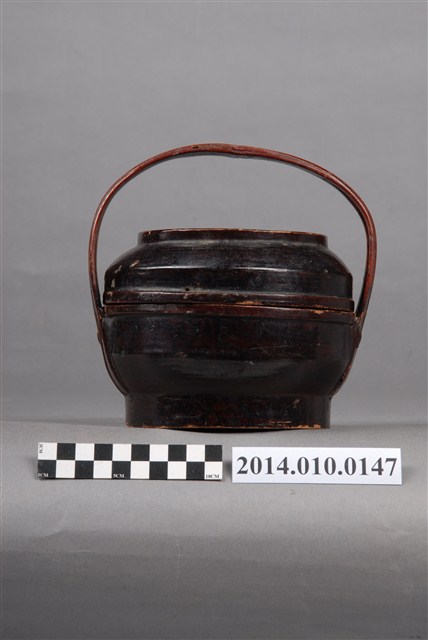 此一檳榔籃未有具體的使用場合及時間脈絡,籃身繪有繁複的黑色線條紋飾。檳榔籃係民間禮俗用品,為小型謝籃。