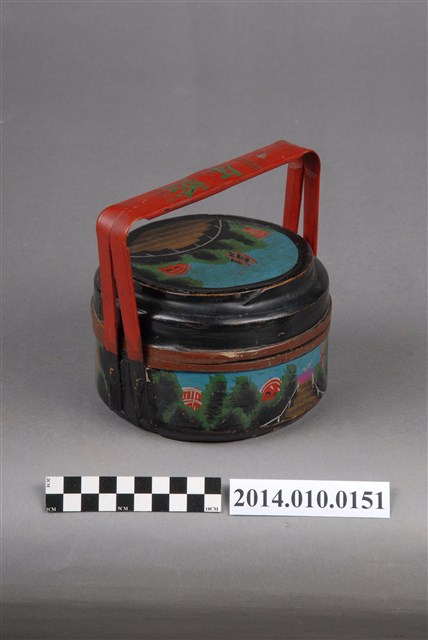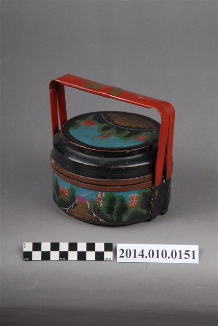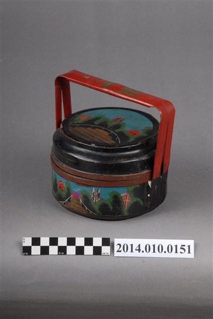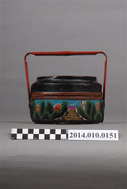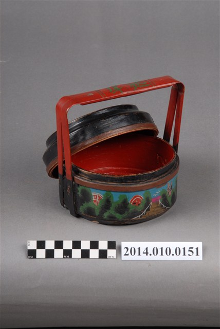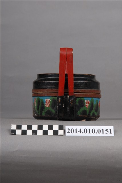此一檳榔籃未有具體的使用場合及時間脈絡。籃身繪有步道、屋舍及山景圖式。籃身的繪圖相似於編號101056-0130之物件,惟兩者的線條色彩不同。檳榔籃係民間禮俗用品,為小型謝籃。