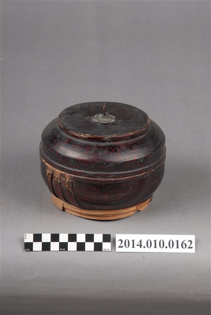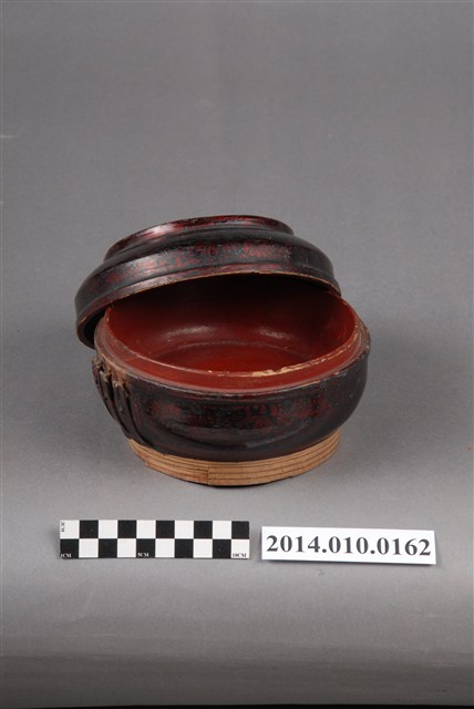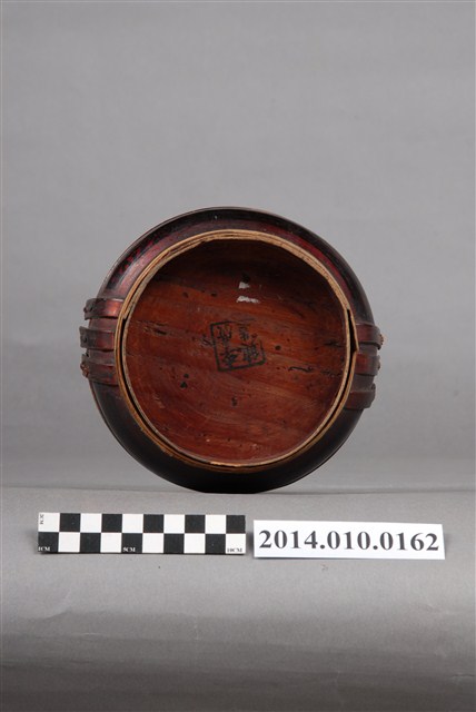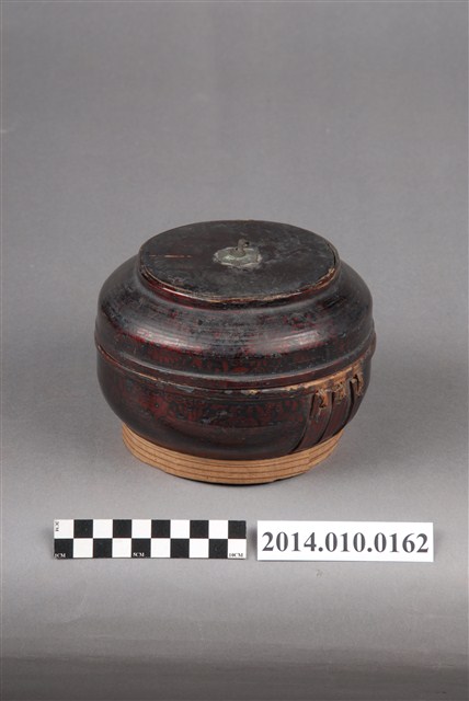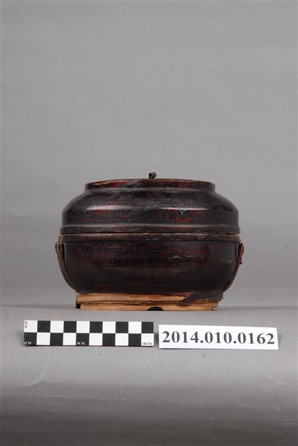 此一檳榔籃的提把已缺失,籃身有黑色紋飾,籃身底座則未上漆。此一物件未有具體的使用者及時間脈絡。檳榔籃係民間禮俗用品,為小型的謝籃。