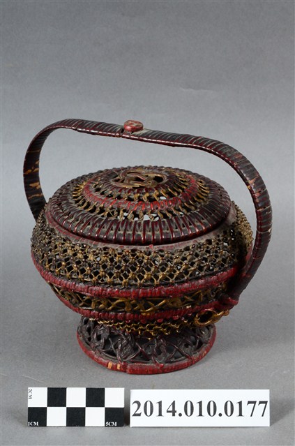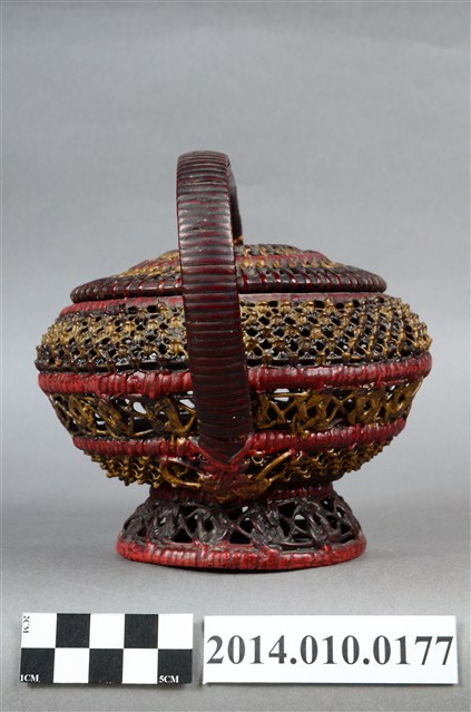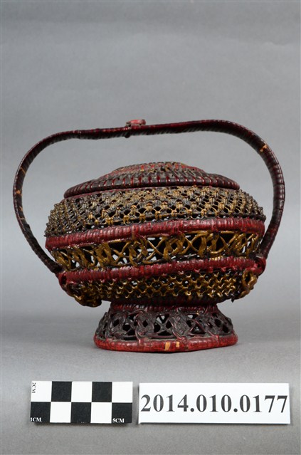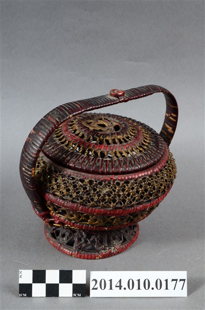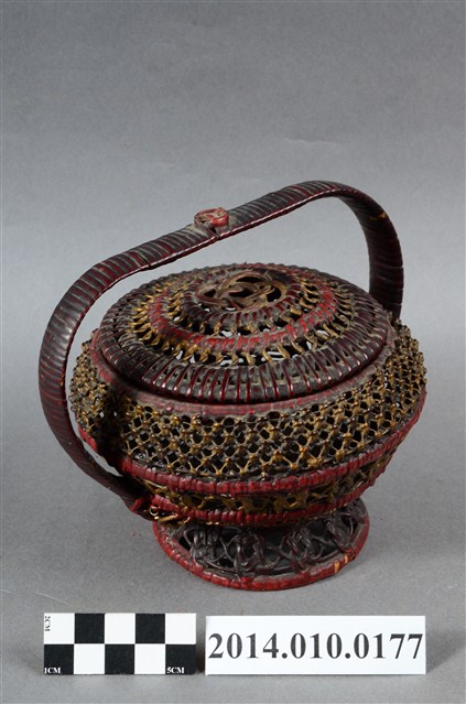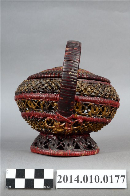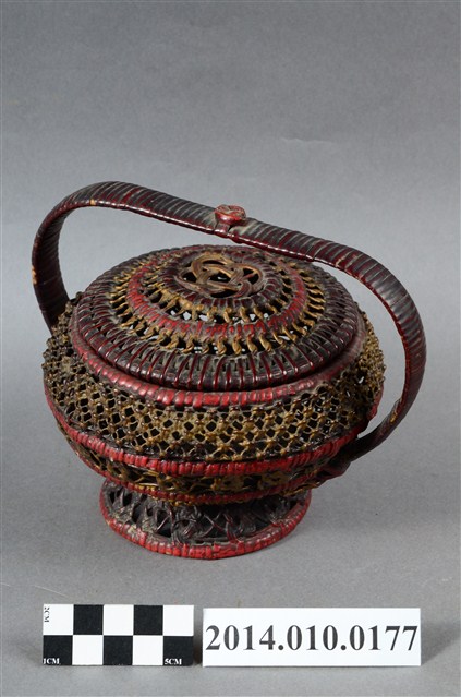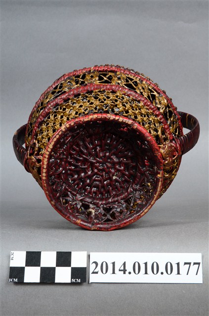 為細藤木條編織的檳榔籃,繁複的編織手法,使得籃身佈滿幾何排列的鏤空,籃座底層亦為同樣精巧的造型。籃身已為傾斜狀態。物件未有具體的使用者及時間脈絡。檳榔籃係民間禮俗用品,為小型的謝籃。