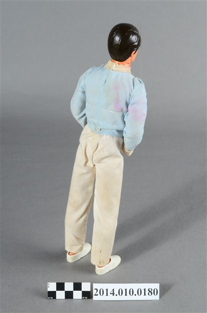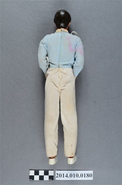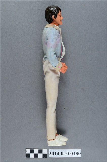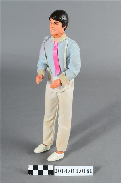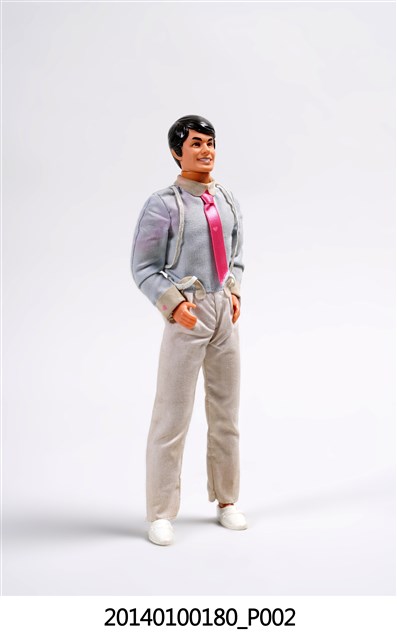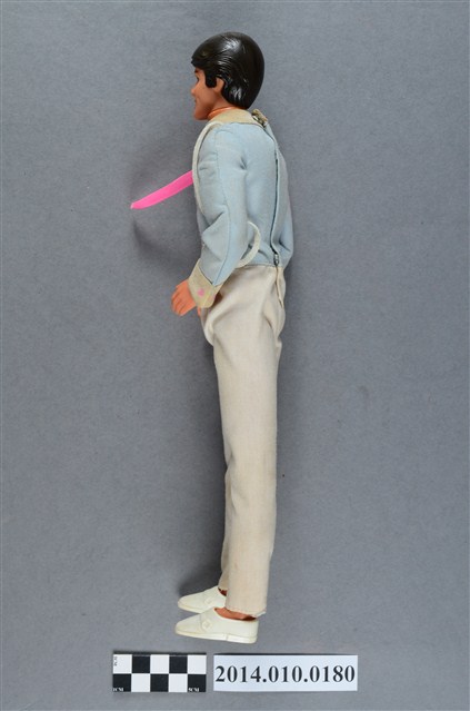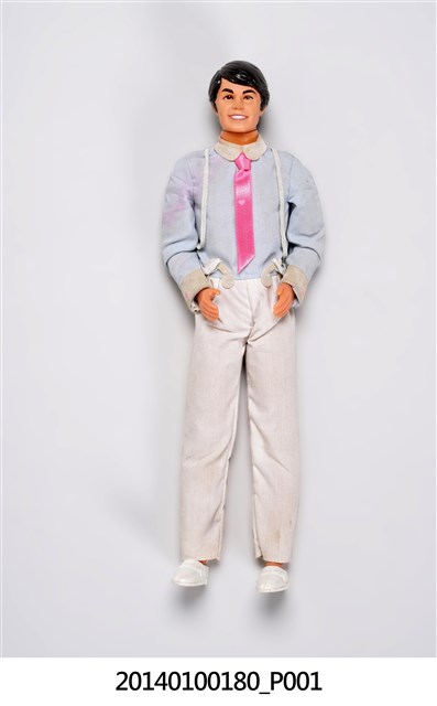 此為玩具芭比娃娃設定的男友,名為肯尼(Ken Sean Carson )。玩偶著藍色休閒服、白色休閒褲及白色休閒鞋,並繫粉紅領帶。芭比娃娃最早出現於1959年舉辦的美國國際玩具展覽會(American International Toy Fair),由Ruth Handler發明,Mattel玩具公司生產發行。而最早的玩具肯尼,則由同公司生產於1961年。民國60年代臺灣為芭比娃娃的加工生產區,在娃娃身軀上印有「Made in Taiwan」字樣,反映出臺灣出口產業的歷史。
