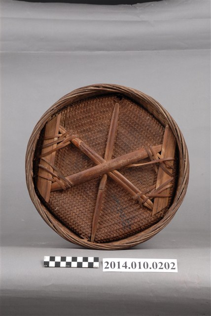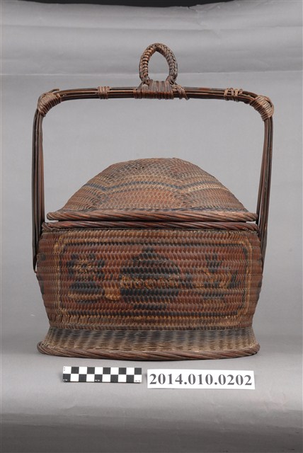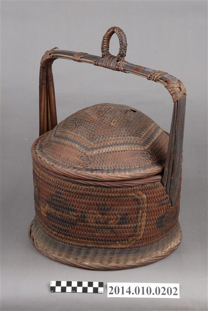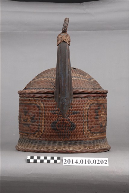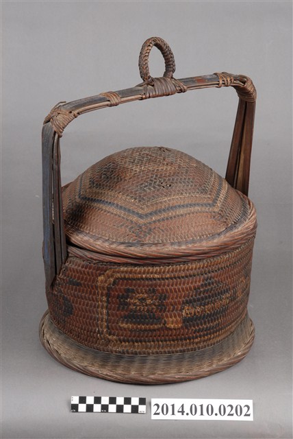由藤木片及細藤木條編織而成的檳榔籃,籃身繪有圖案,籃蓋凸起狀似帽形。物件未有具體的使用者及時間脈絡。