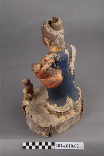 本件為木刻的鳥母神像,背上及懷裡,及左右兩旁各有一名小孩。鳥母即為床母,祭拜以求小孩安穩好睡、平安長大。據收藏家洪輝龍所述,為清代神像。缺乏具體的時間及使用者脈絡。