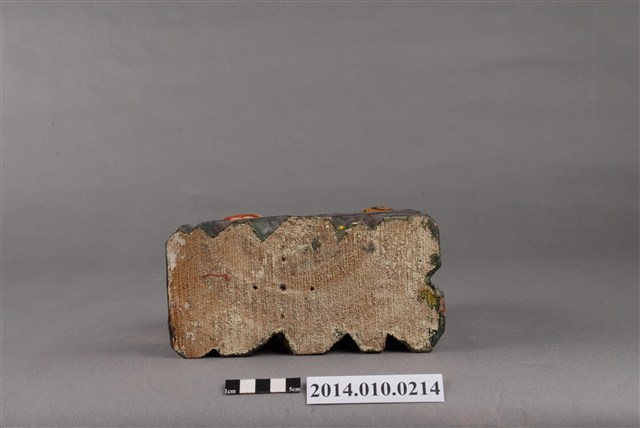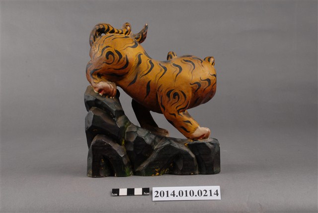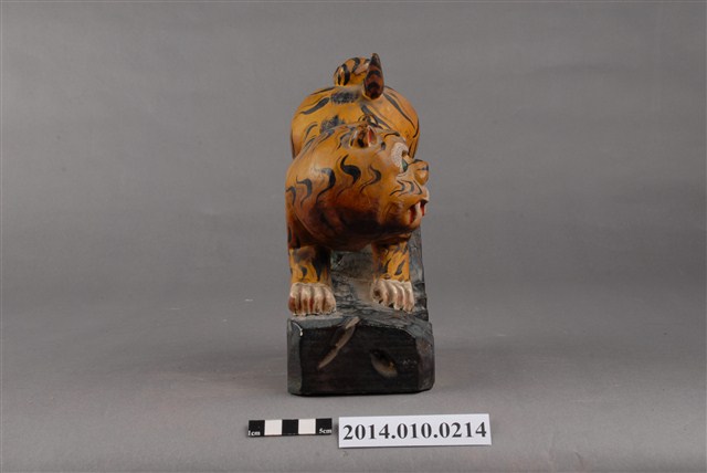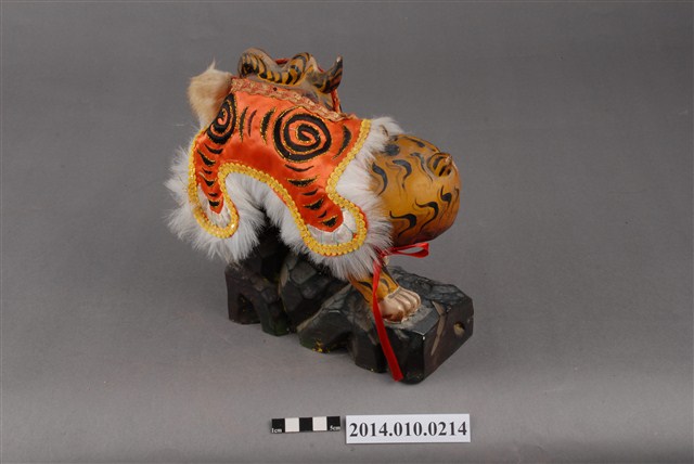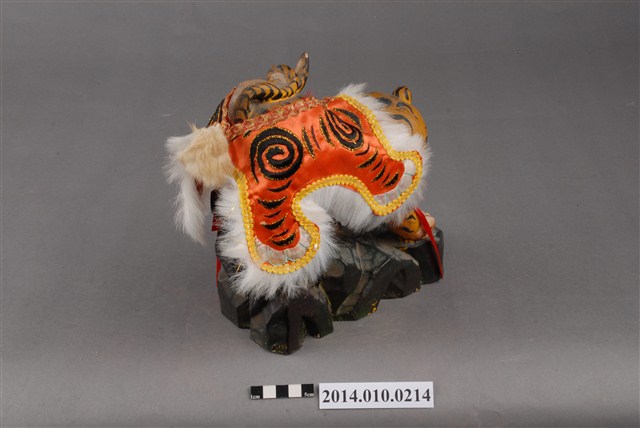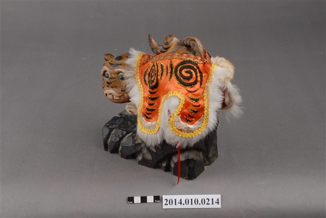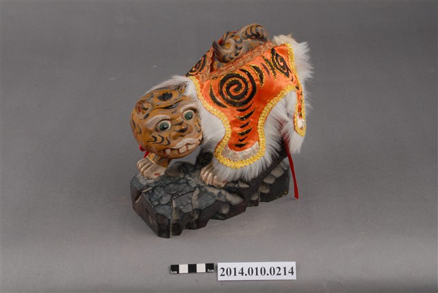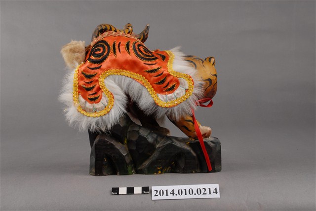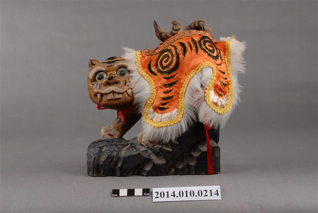 本件為木刻的虎爺神像,另身上外批繡彩絨毛衣飾。全身呈站立,後身弓起的姿態,面孔觀看右前方。據收藏家洪輝龍所述,為清代神像,然缺乏具體的時間及使用者脈絡。