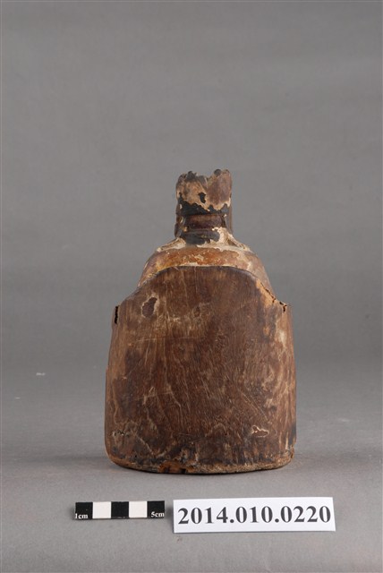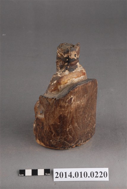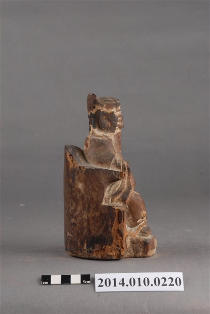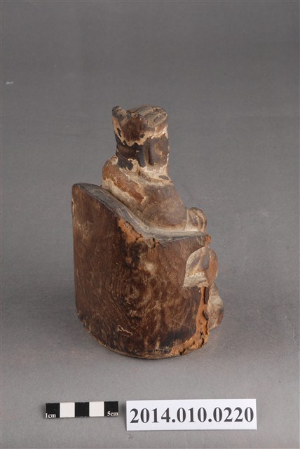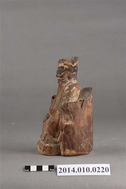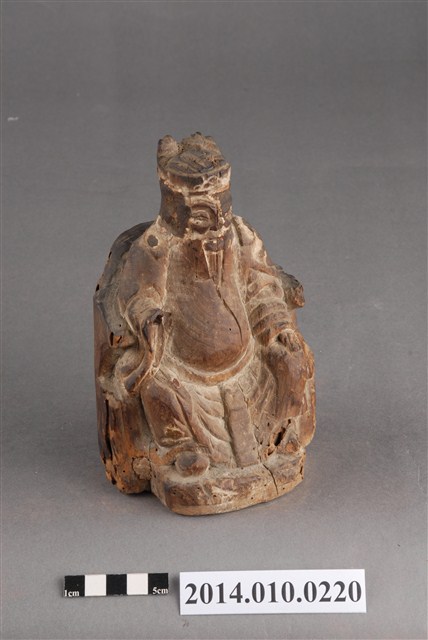 本件為木刻的土地公神像,呈坐姿,臉部有薰黑色澤;右手掌已毀損,臉部及身有多處龜裂痕跡。據收藏家洪輝龍所述,為清代神像,缺乏具體的時間及使用者脈絡。