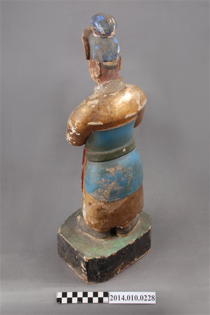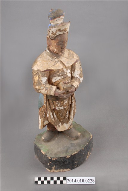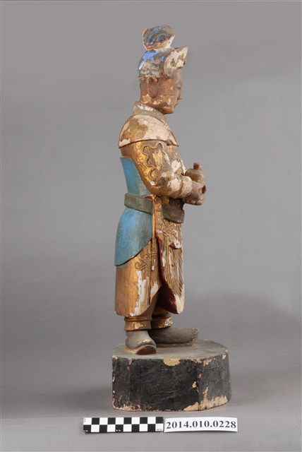 本件為木刻的關平神像,呈站姿,左右手持有盒狀物;顏彩有多處剝落,本件缺乏具體的時間及使用者脈絡。